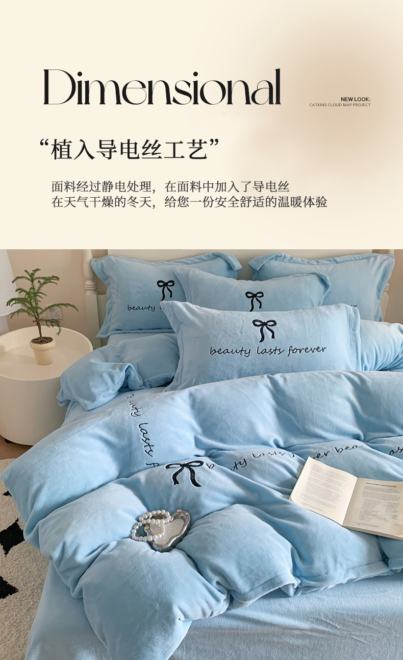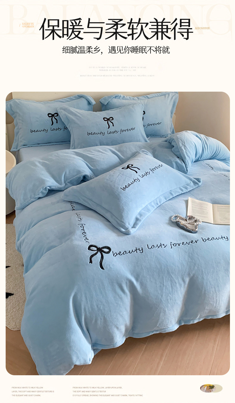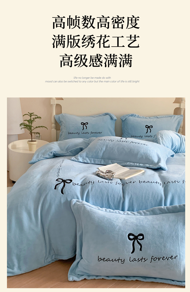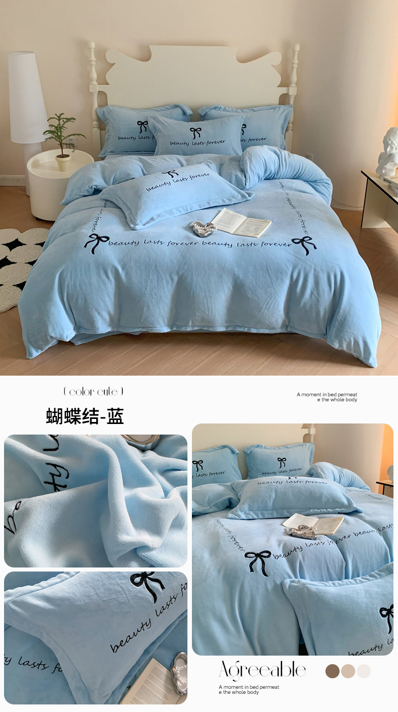 当前位置: 91家纺网 > 商品网购 > 床品套件 > 四件套 > 牛奶绒四件套 > 你好美丽 2025新款200克牛奶绒四件套--蝴蝶结 蝴蝶结蓝