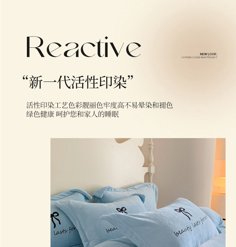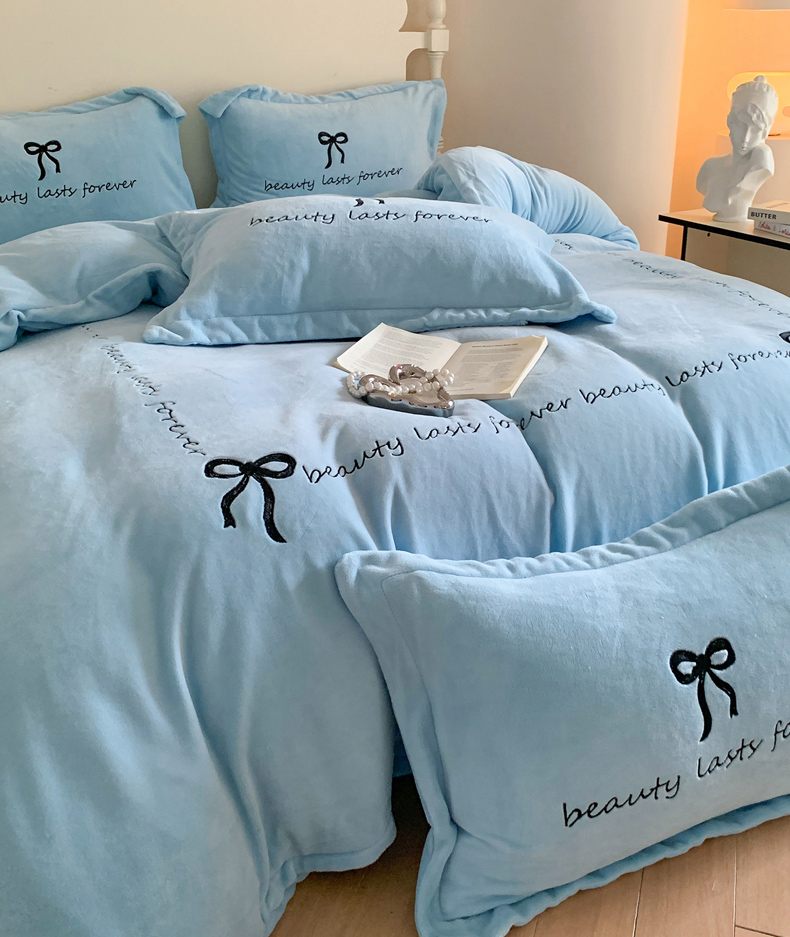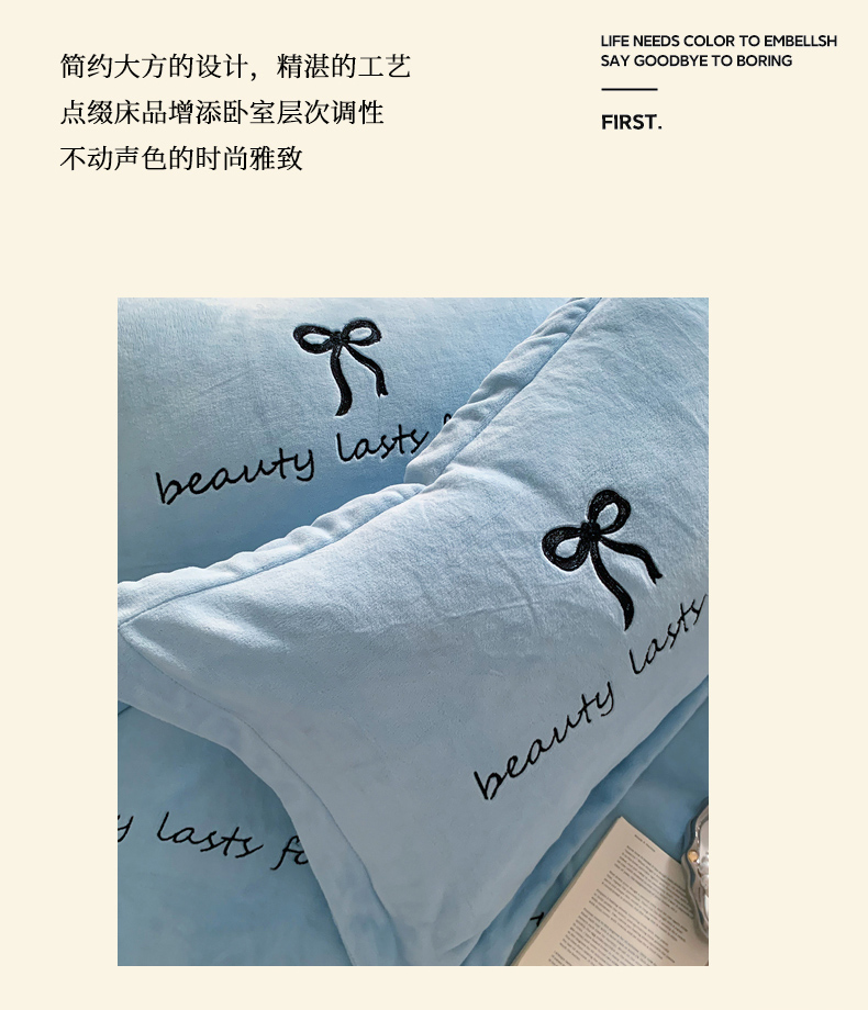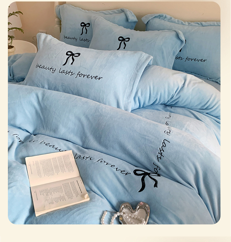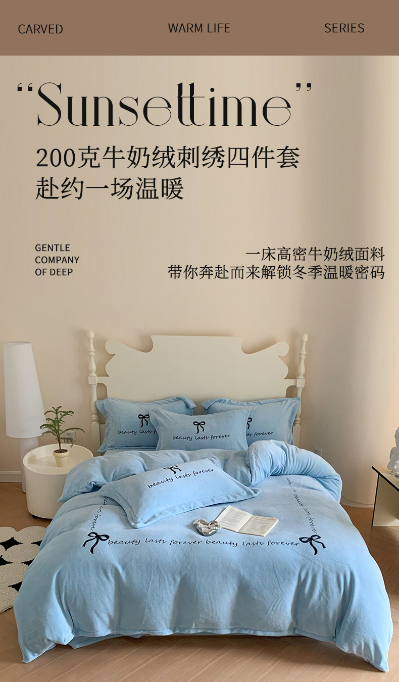 当前位置: 91家纺网 > 商品网购 > 床品套件 > 四件套 > 牛奶绒四件套 > 你好美丽 2025新款200克牛奶绒四件套--蝴蝶结 蝴蝶结蓝