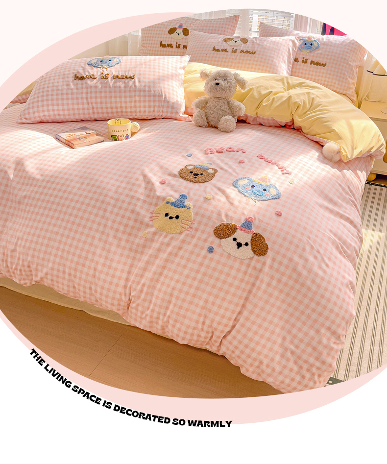 你好美丽 2025新款水洗棉小象乐园毛巾绣格子工艺款吊球毛巾绣四件套 小象乐园-粉