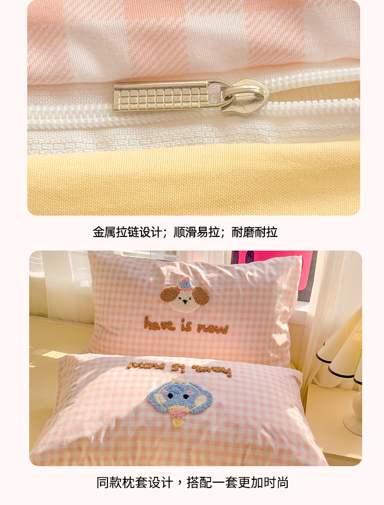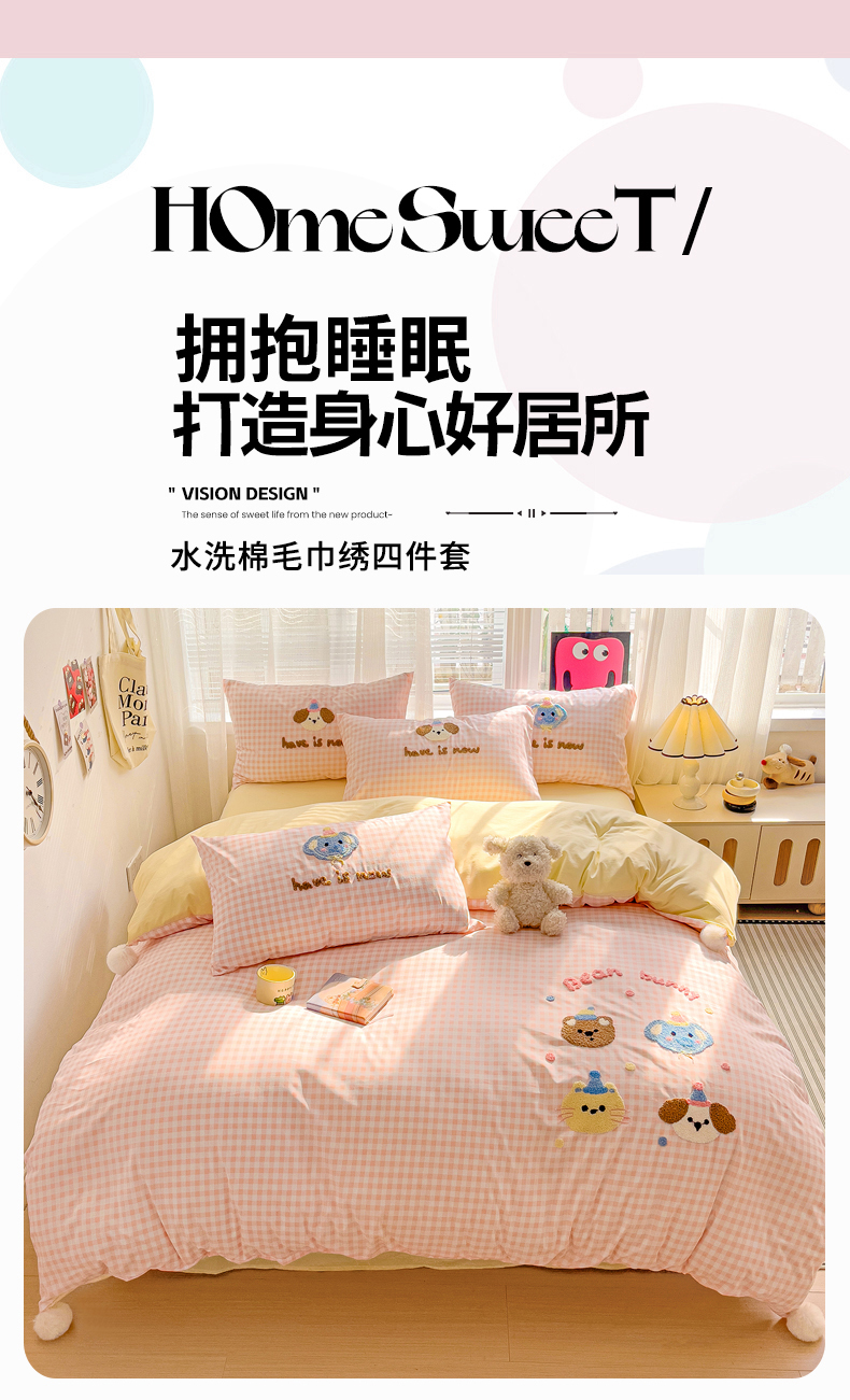 商品名称:你好美丽 2025新款水洗棉小象乐园毛巾绣格子工艺款吊球毛巾绣四件套 小象乐园-粉