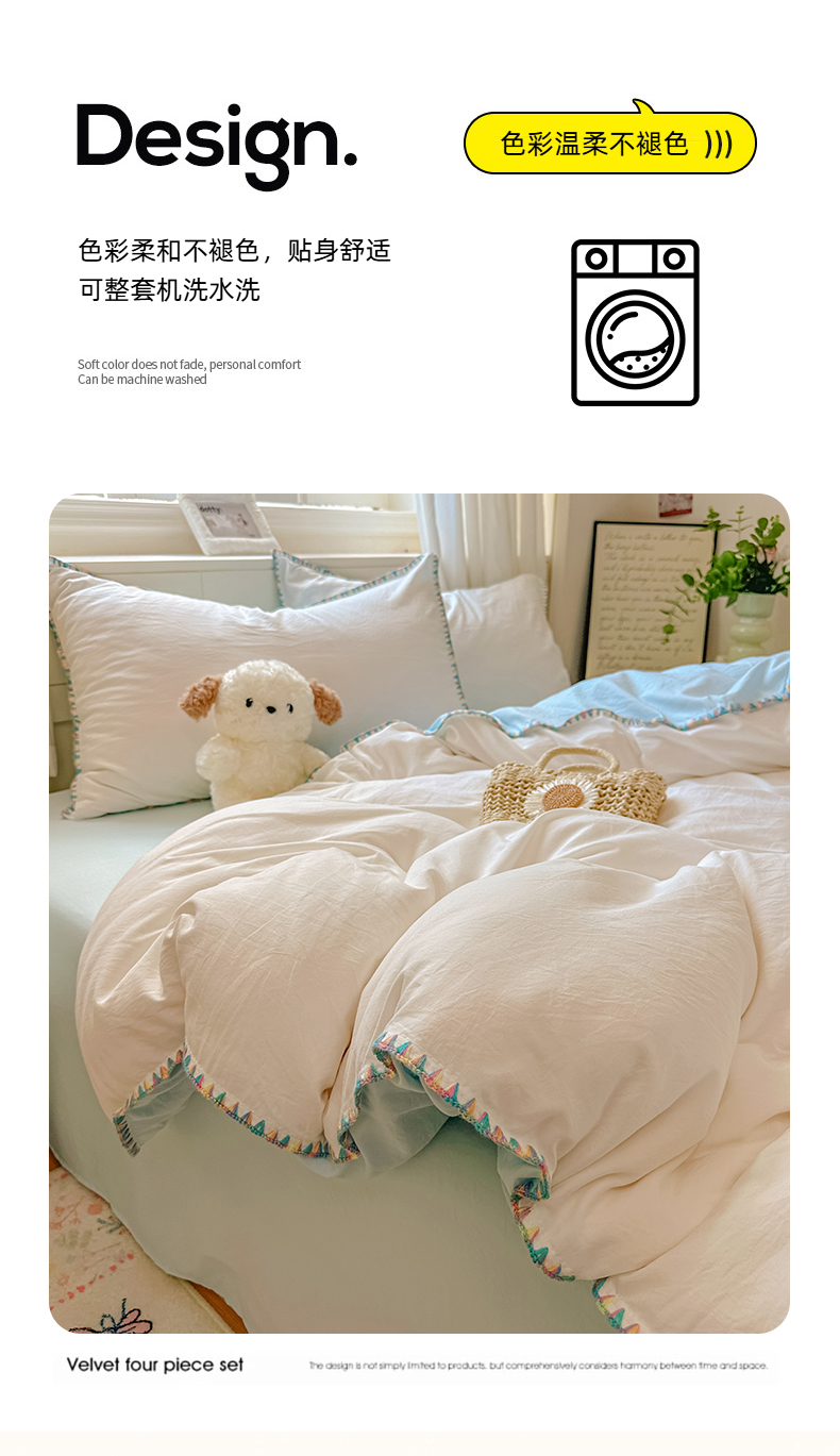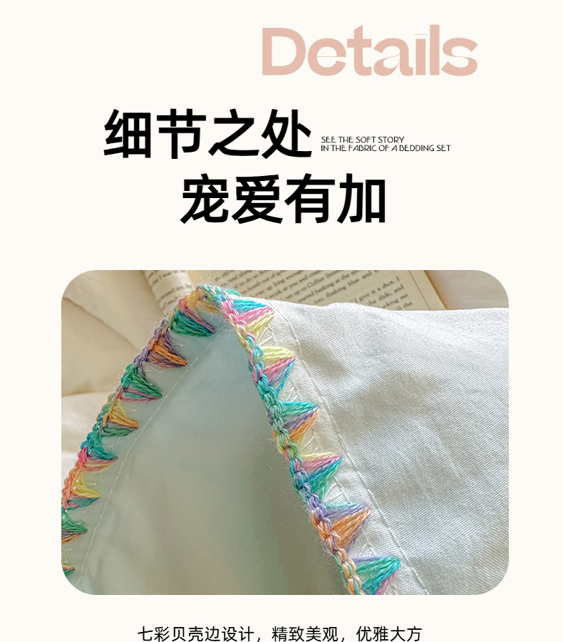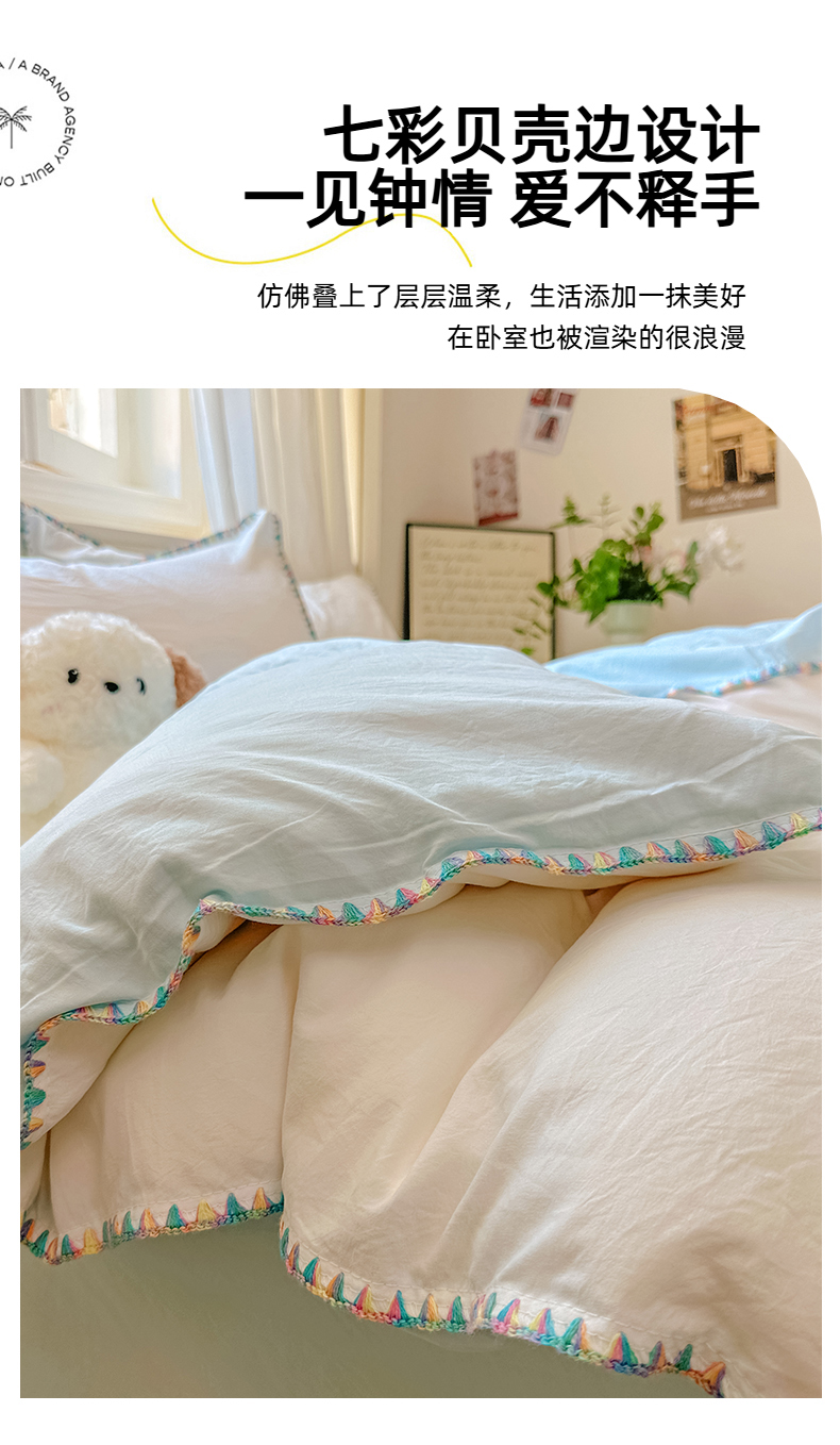 当前位置: 91家纺网 > 商品网购 > 床品套件 > 四件套 > 水洗棉四件套 > 冕悠家纺 2025新款A类七彩贝壳边水洗棉四件套 七彩-春芜绿奶白