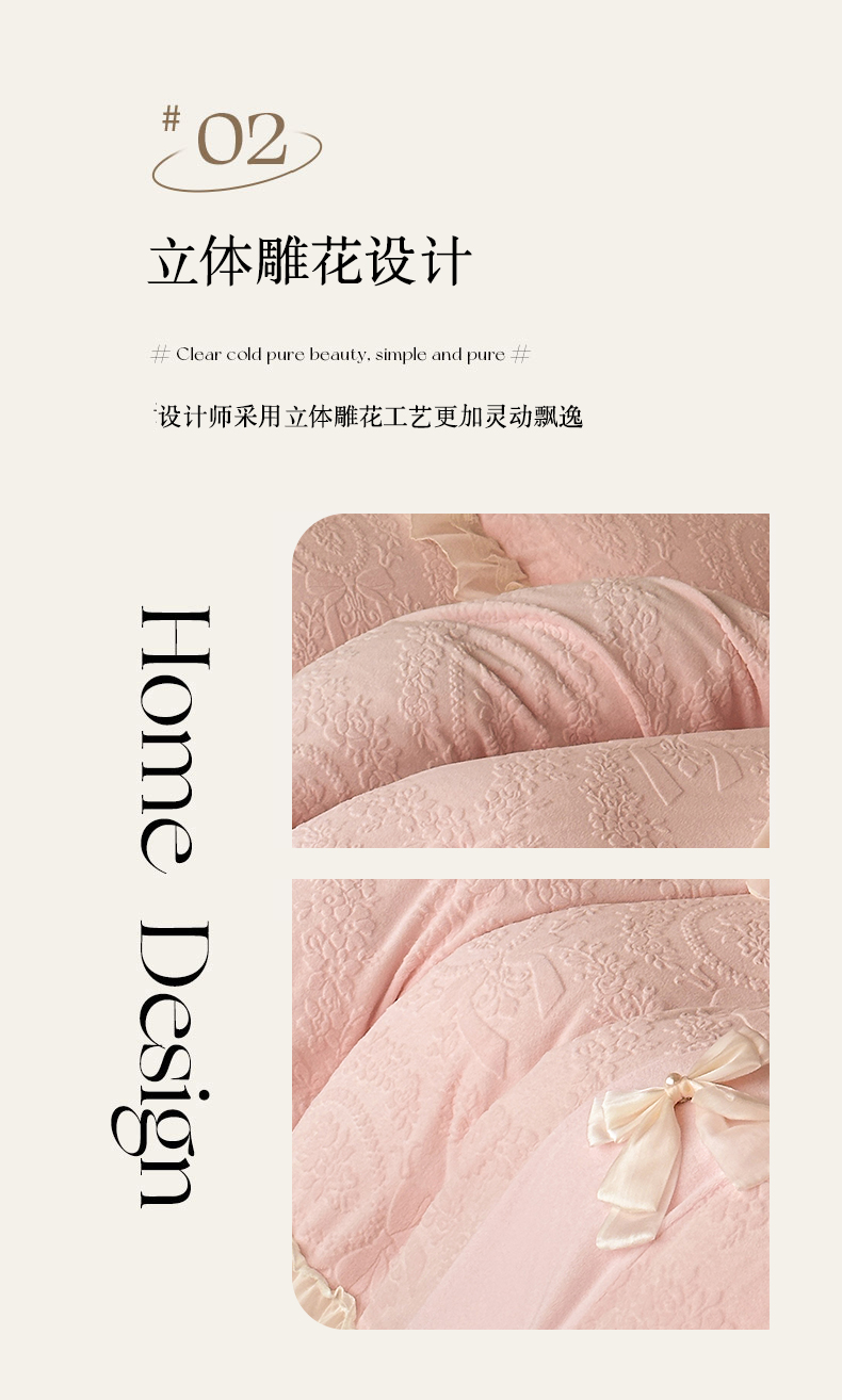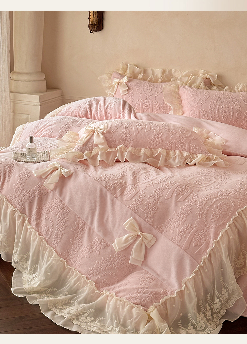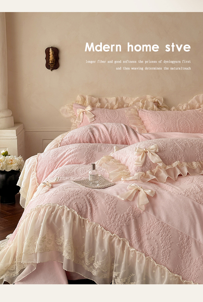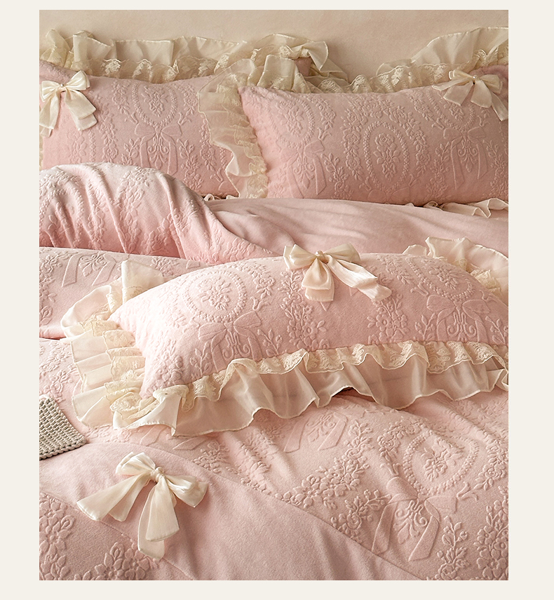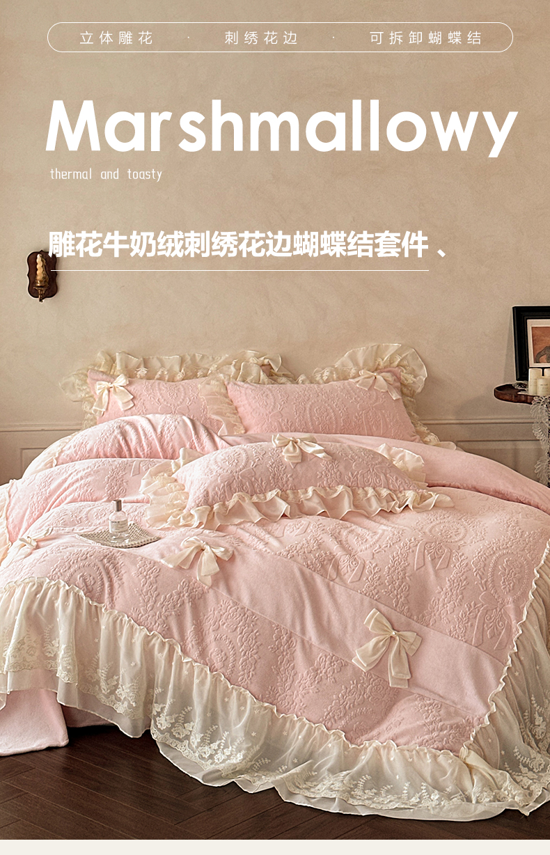 当前位置: 91家纺网 > 商品网购 > 床品套件 > 四件套 > 牛奶绒四件套 > 你好美丽 2025新款雕花牛奶绒刺绣花边蝴蝶结四件套-黛玉系列 黛玉粉