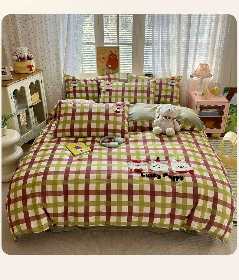 (总)曼之夏 2025新款全棉纯棉40支学生季卡通印花四件套,椰蓝小腊肠,茶茶狗,格子猫,嗨皮狗,开心屋,可爱多,可可汪,玛奇朵,奶昔小熊,泡芙小象,曲奇小狗,趣味熊,甜甜圈,甜心猫咪,童画,小狗日记,樱桃熊仔