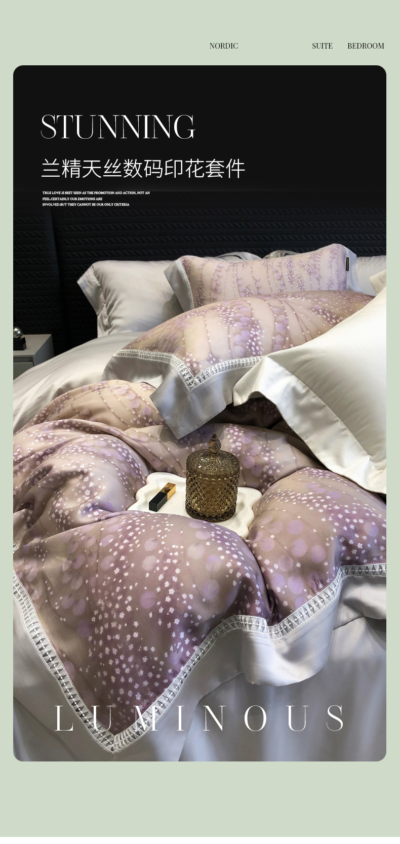 (总)黑白森林 2026新款轻奢天丝印花四件套,未央-绿,未央-紫,邂逅-粉,邂逅-灰,云馥-粉,云馥-紫