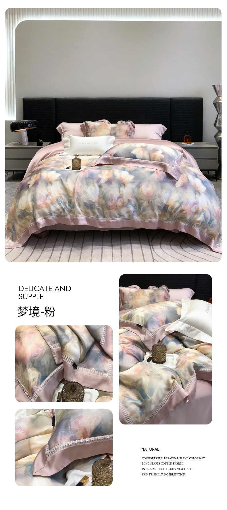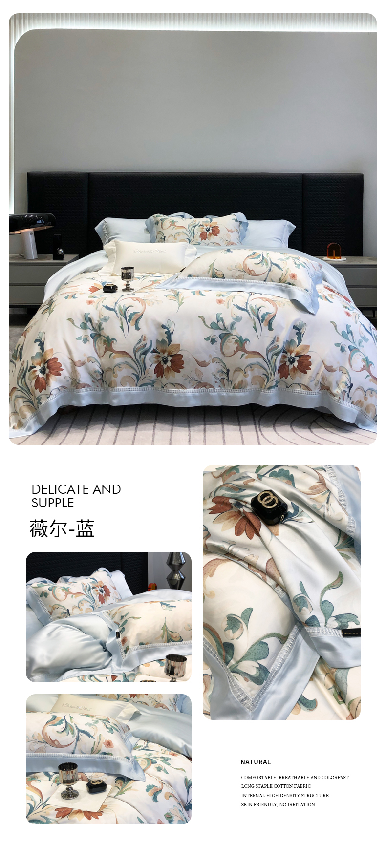 黑白森林2024款 50X50S高支天丝棉数码印花四件套天丝全棉,伊芙琳-粉,伊芙琳-蓝