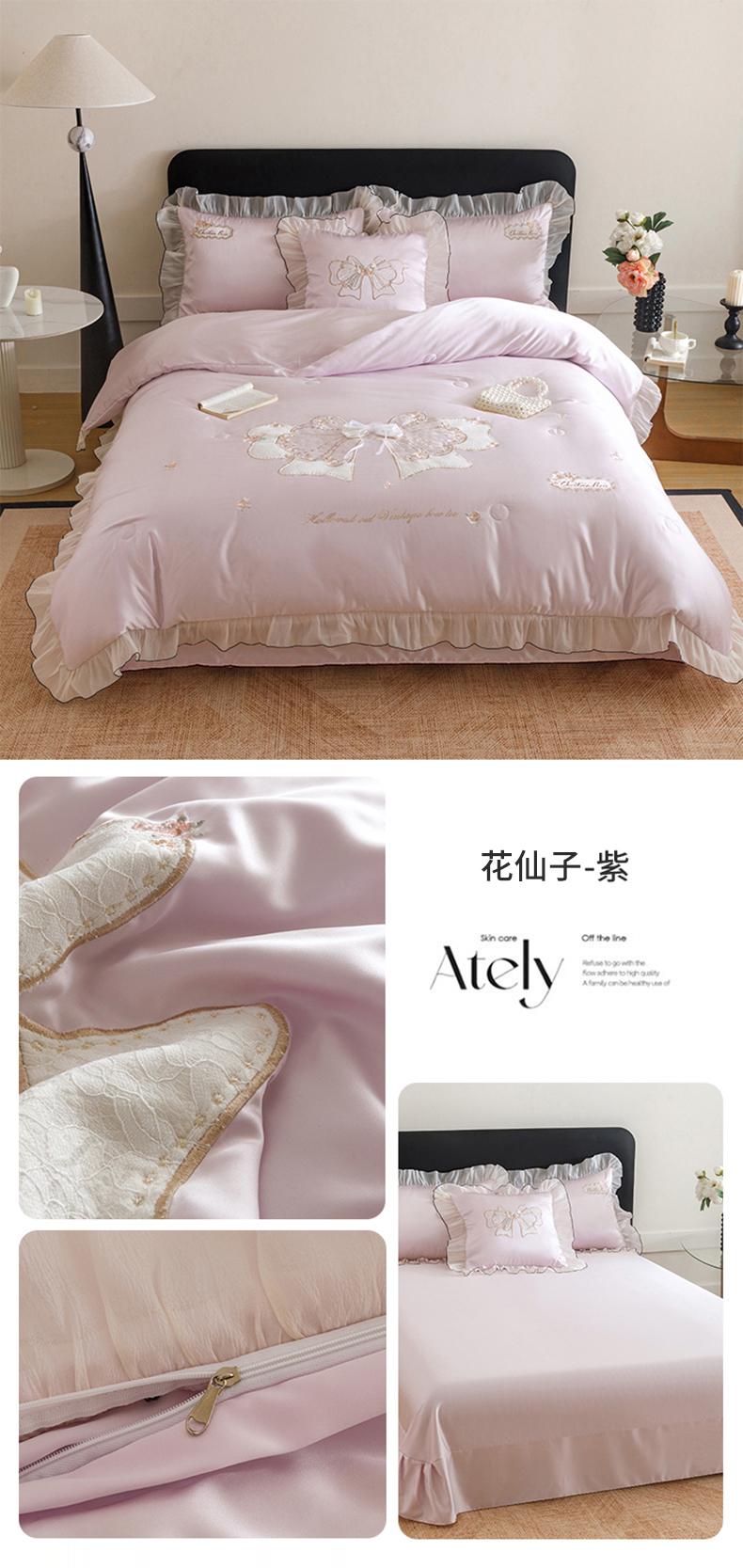 (总)绒棉世家 2026新款提花冰丝刺绣床盖四件套,蝴蝶结-粉玉,蝴蝶结-奶白,蝴蝶结-雅紫