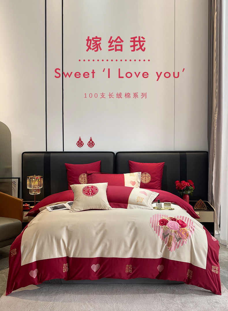 商品名称:甜咪咪婚庆 2026新款长绒棉全棉绣花结婚婚庆四件套多件套床单款 嫁给我