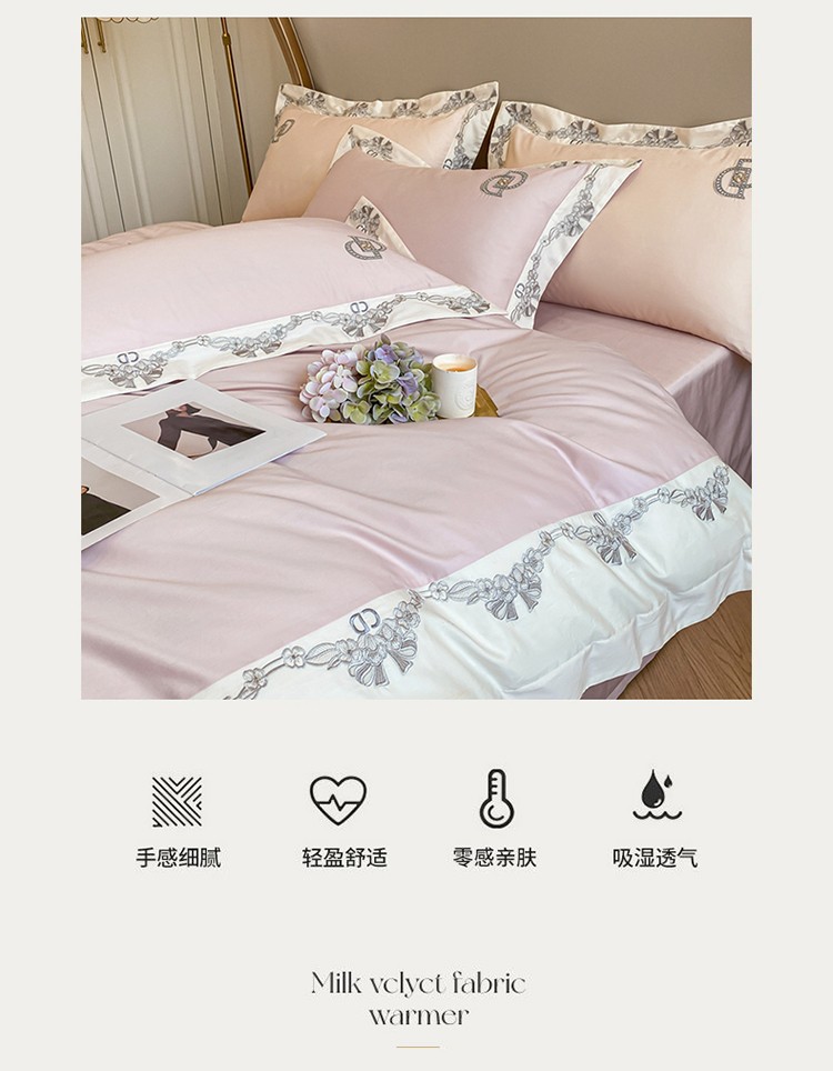 (总)2025新款牛奶绒拼纱四件套-洛可可,白色,粉紫,蓝色,浅灰色,水绿