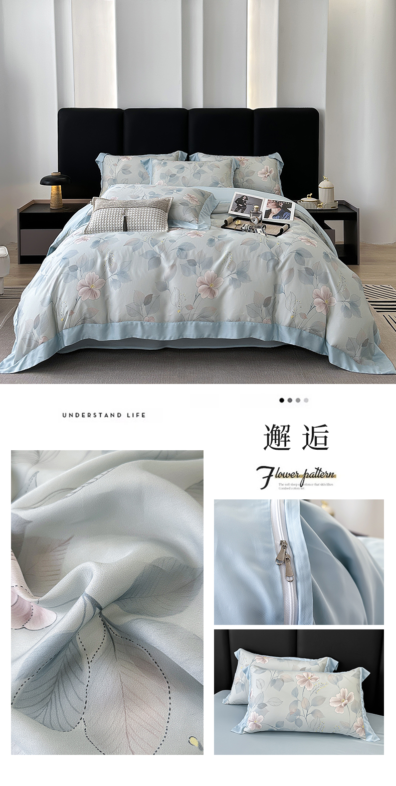 商品名称:娇逸家居 2025新款50支莱赛尔数码印花宽边拼角天丝四件套(可搭配同系列夏被和床盖) 邂逅