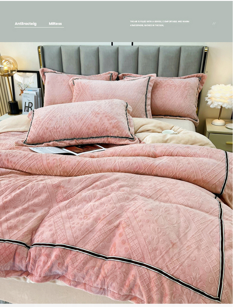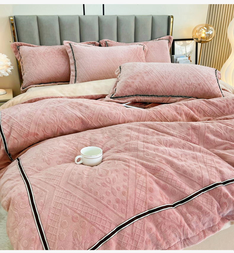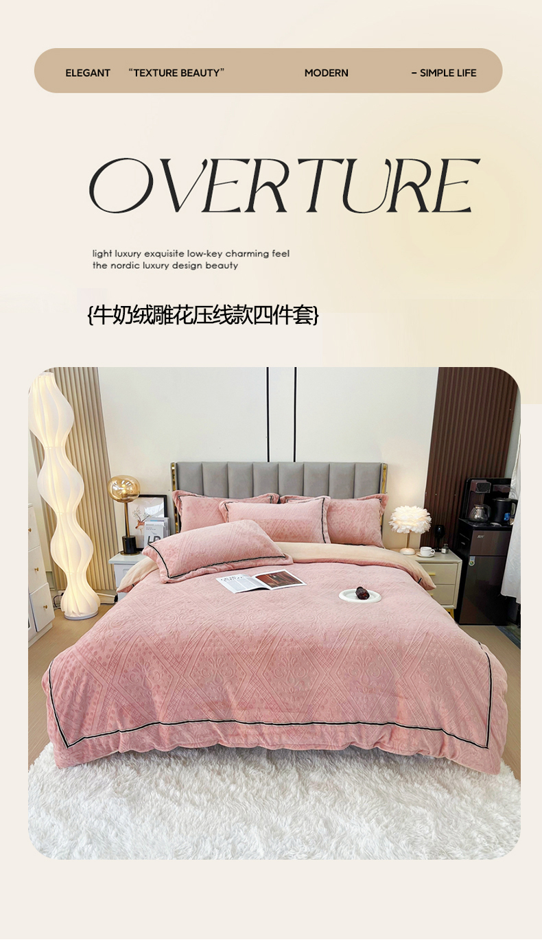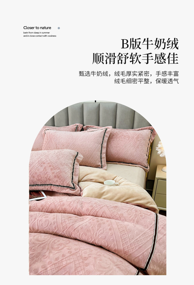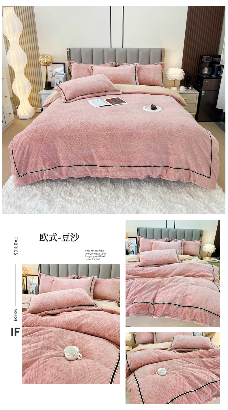逸林家纺《原希尔顿逸林》 2024新款牛奶绒雕花压线款四件套 欧式-豆沙