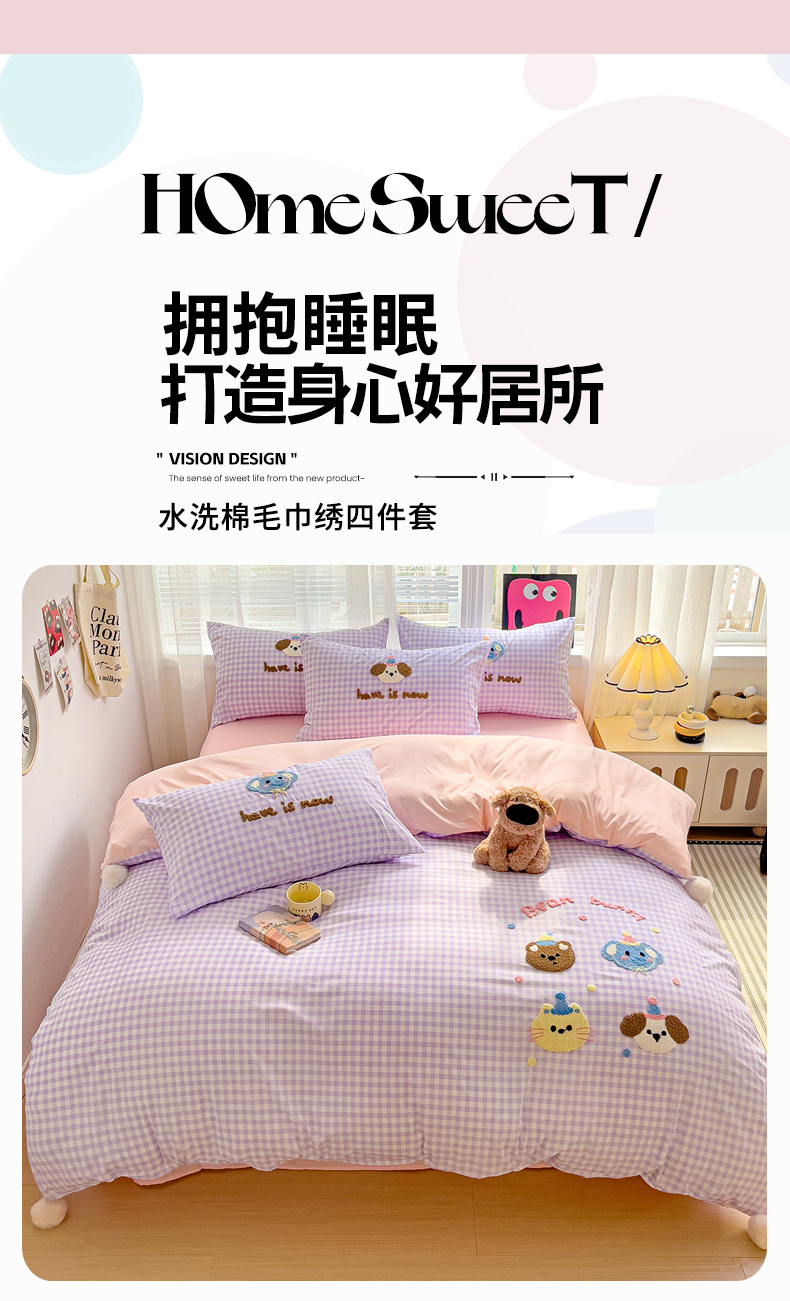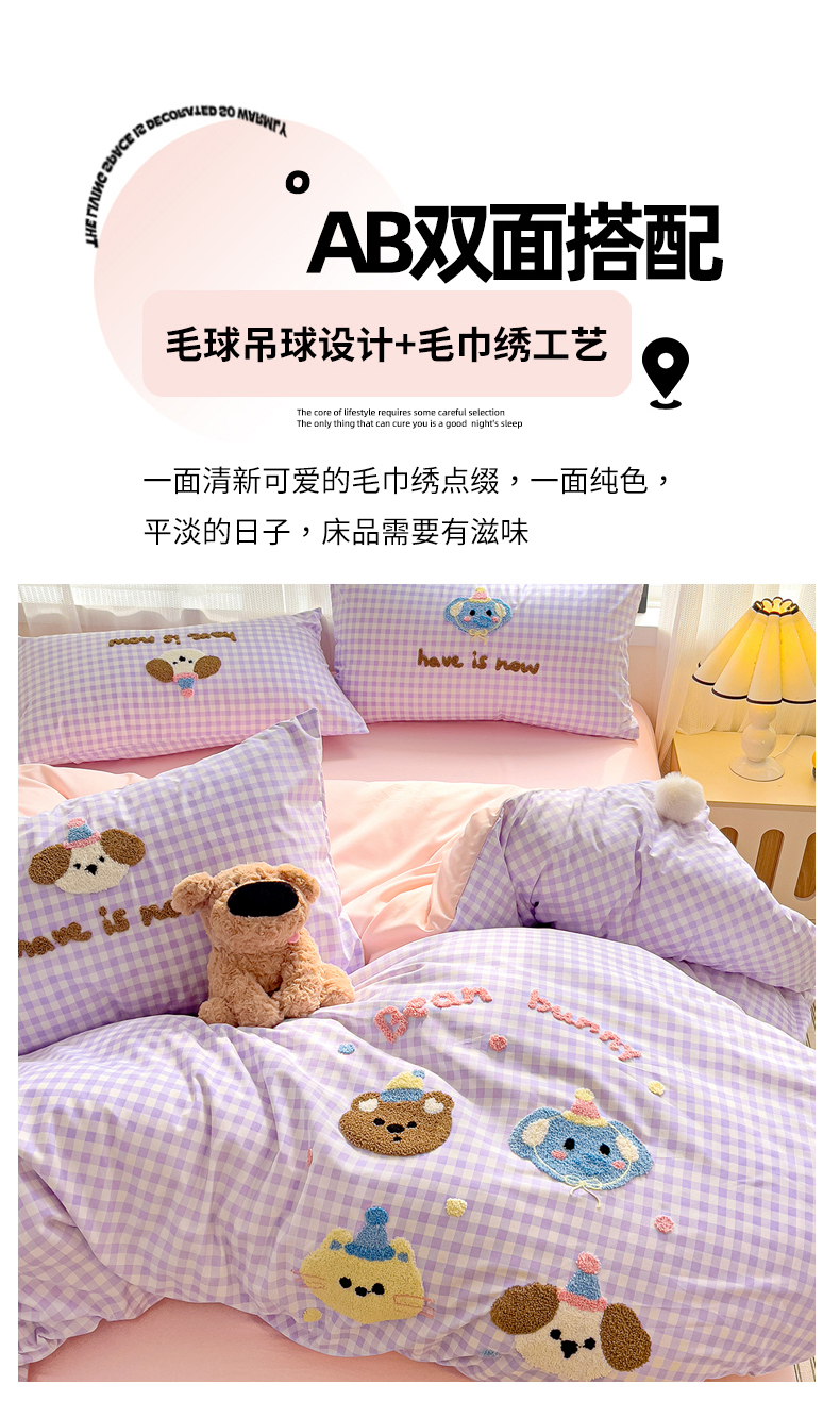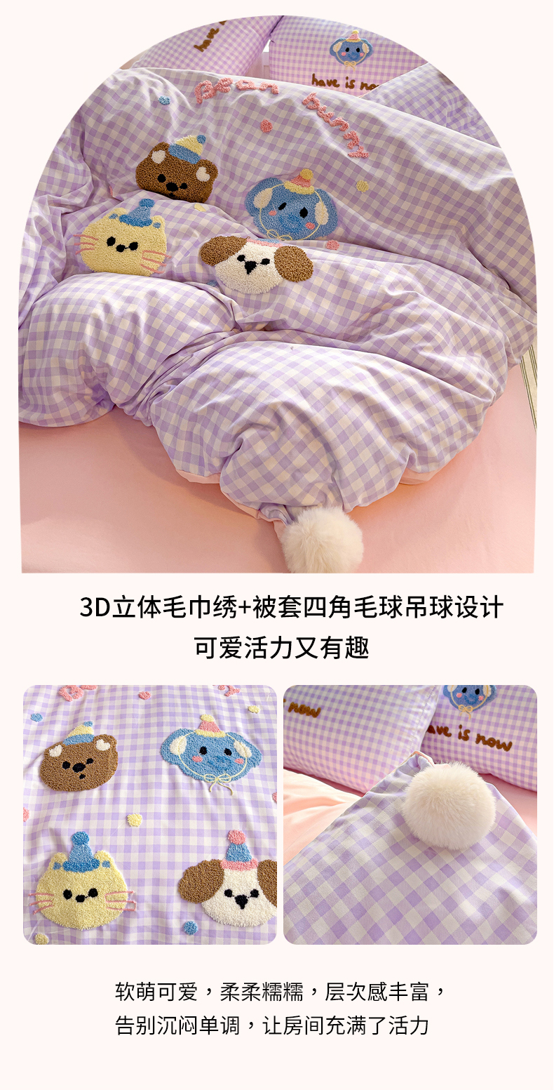 商品名称:你好美丽 2025新款水洗棉小象乐园毛巾绣格子工艺款吊球毛巾绣四件套 小象乐园-紫