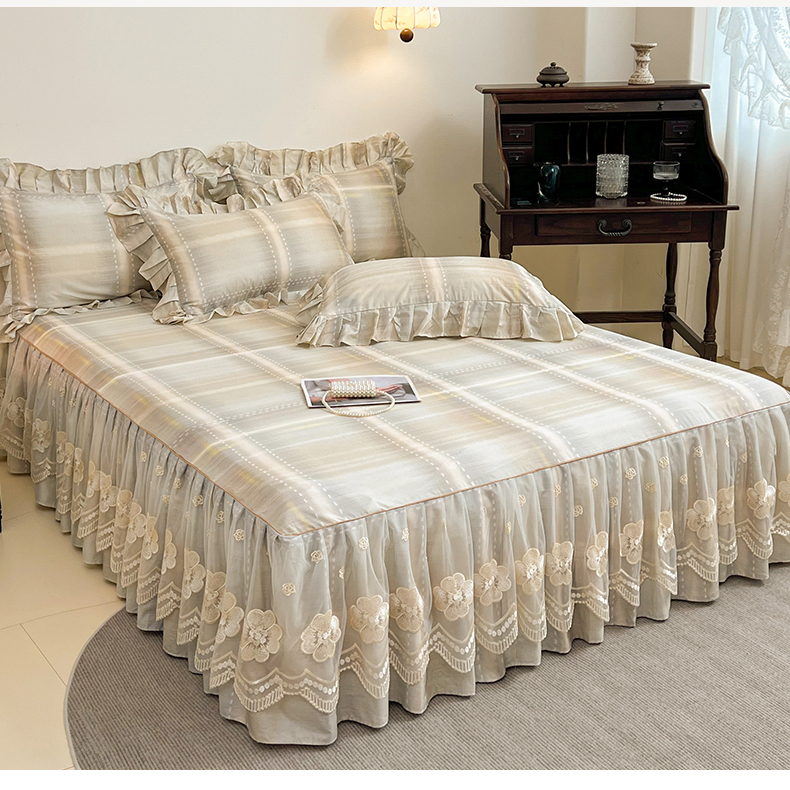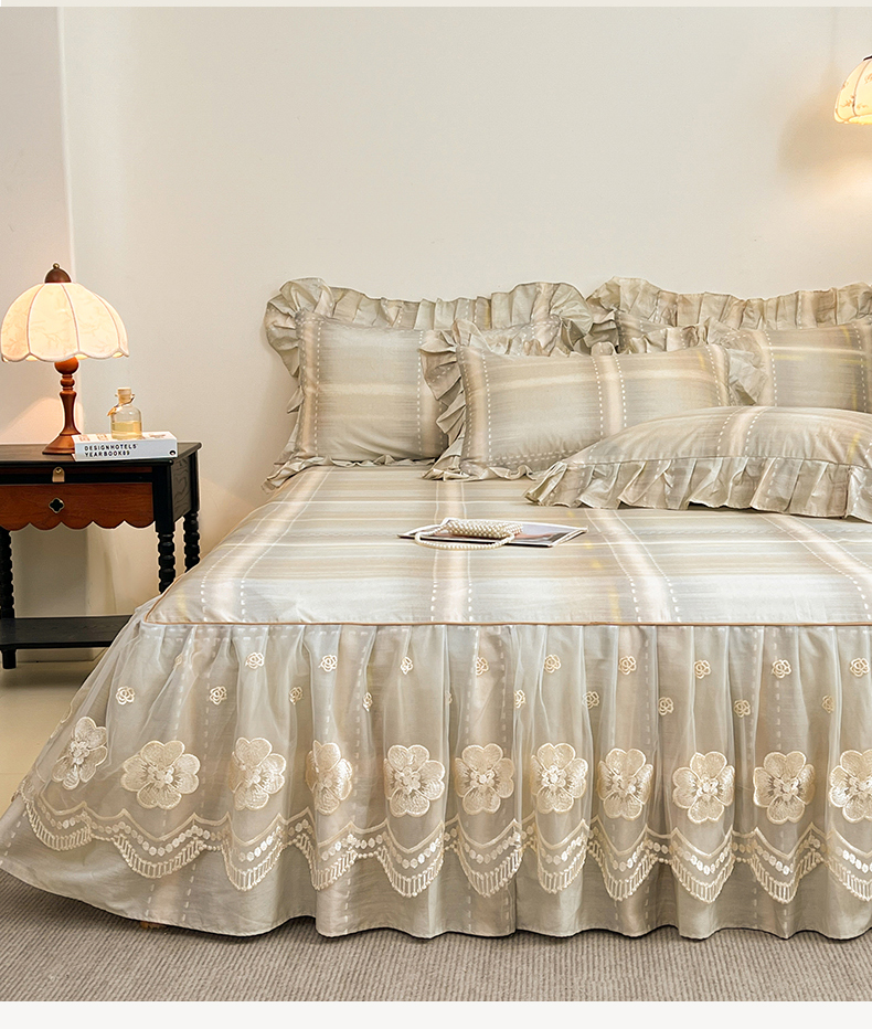 宜凡家纺 2026新款全棉数码印花单层床裙格子系列单床裙三件套 光之羽 绿