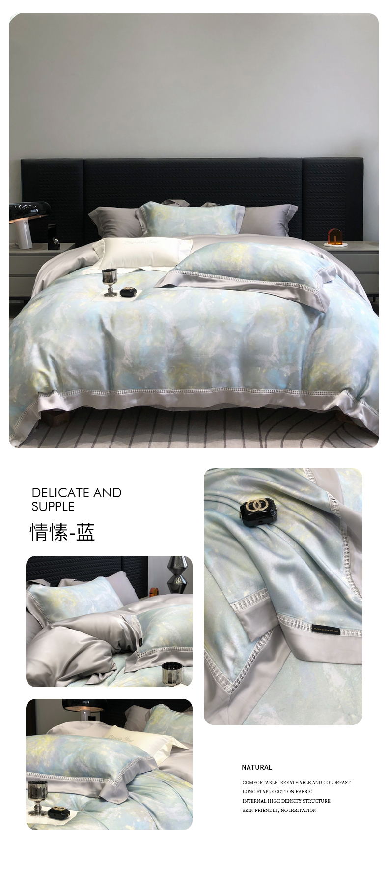 黑白森林2024款 50X50S高支天丝棉数码印花四件套天丝全棉,格伦黄,格伦绿,若瑶灰,羽笛蓝