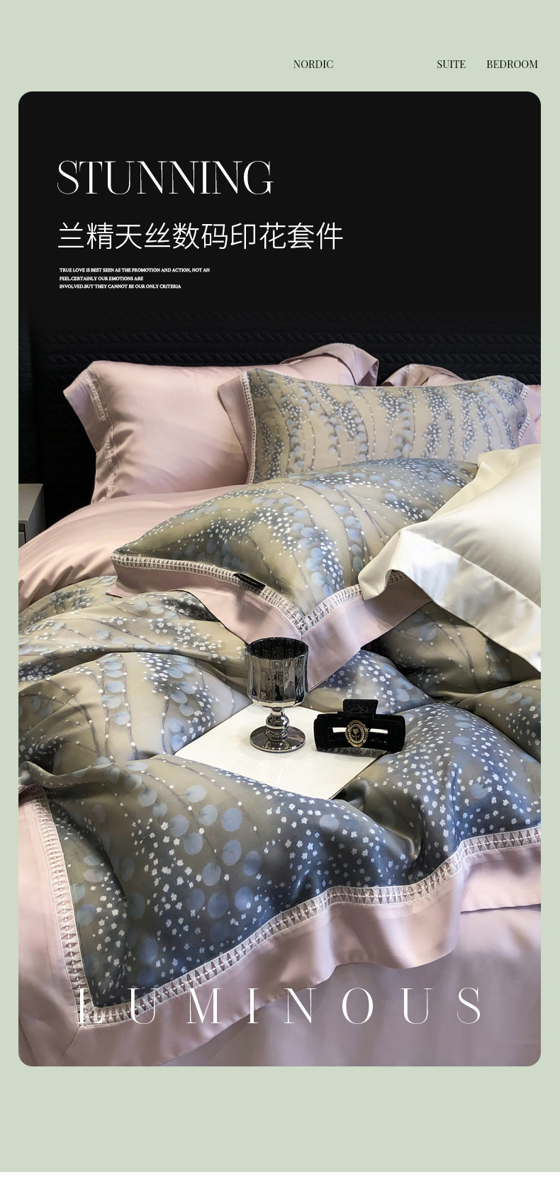 (总)黑白森林 2026新款轻奢天丝印花四件套,未央-绿,未央-紫,邂逅-粉,邂逅-灰,云馥-粉,云馥-紫