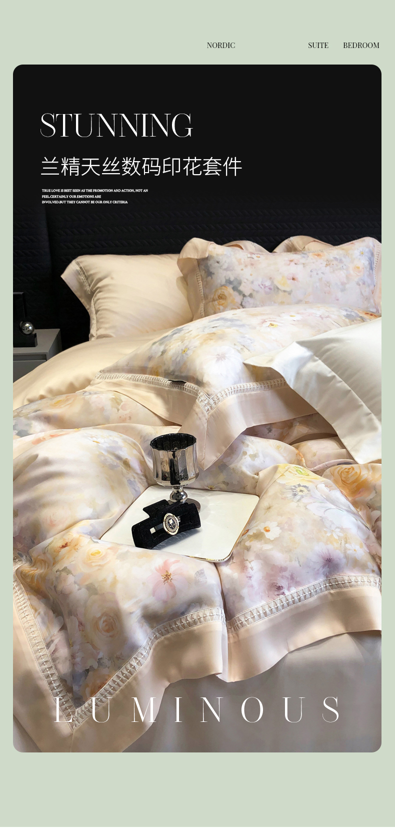 黑白森林2024款 50X50S高支天丝棉数码印花四件套天丝全棉,格伦黄,格伦绿,若瑶灰,羽笛蓝