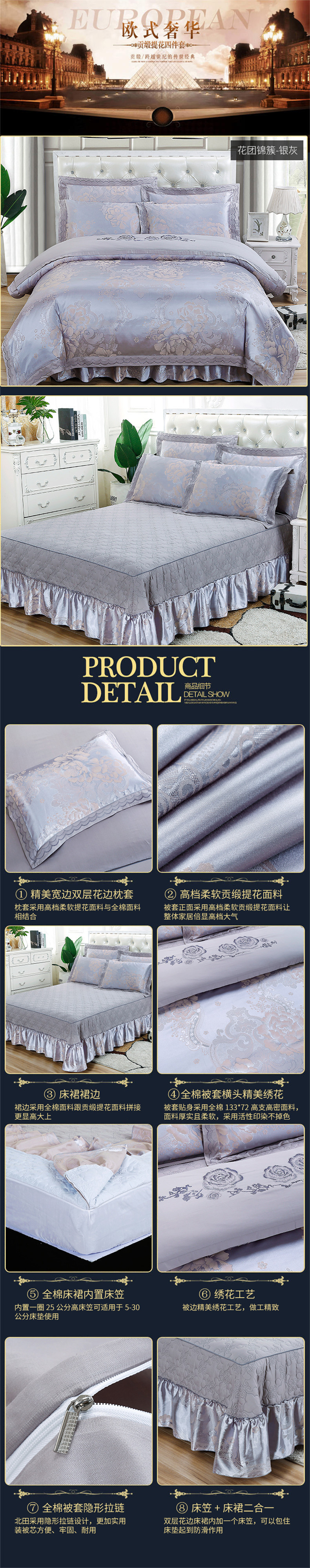 商品名称:福丽莱家纺 2023新款贡缎提花床裙四件套(夹棉)花团锦簇-银灰