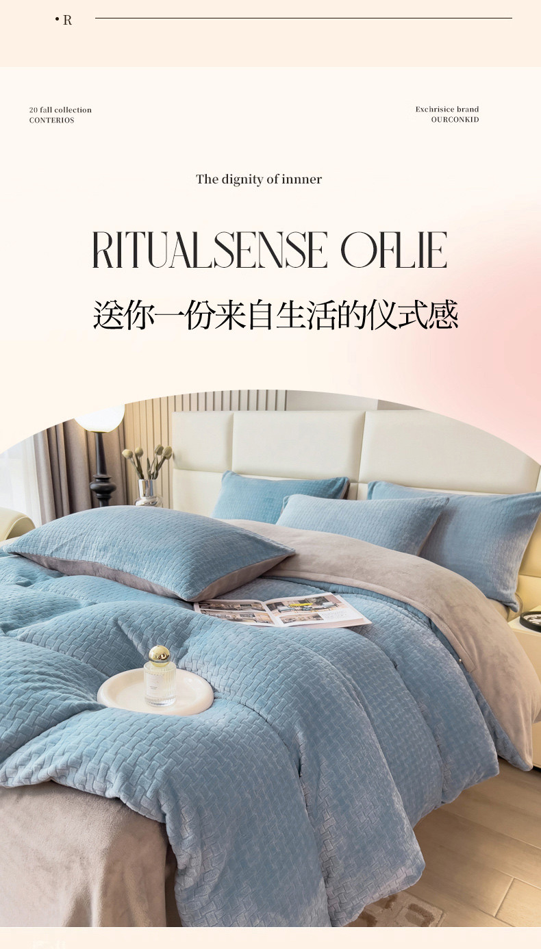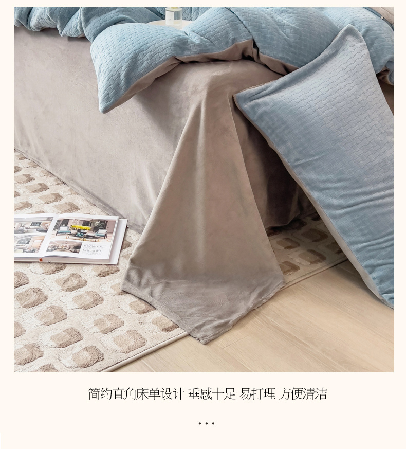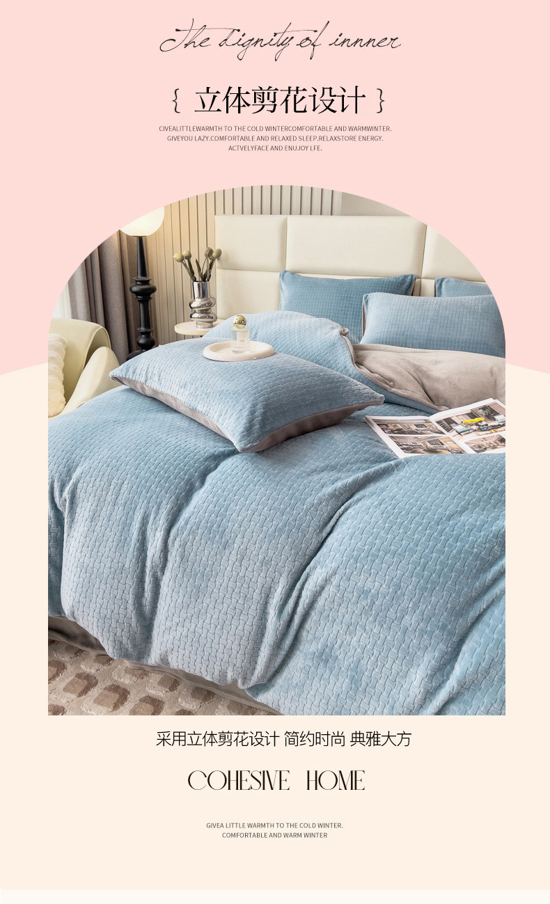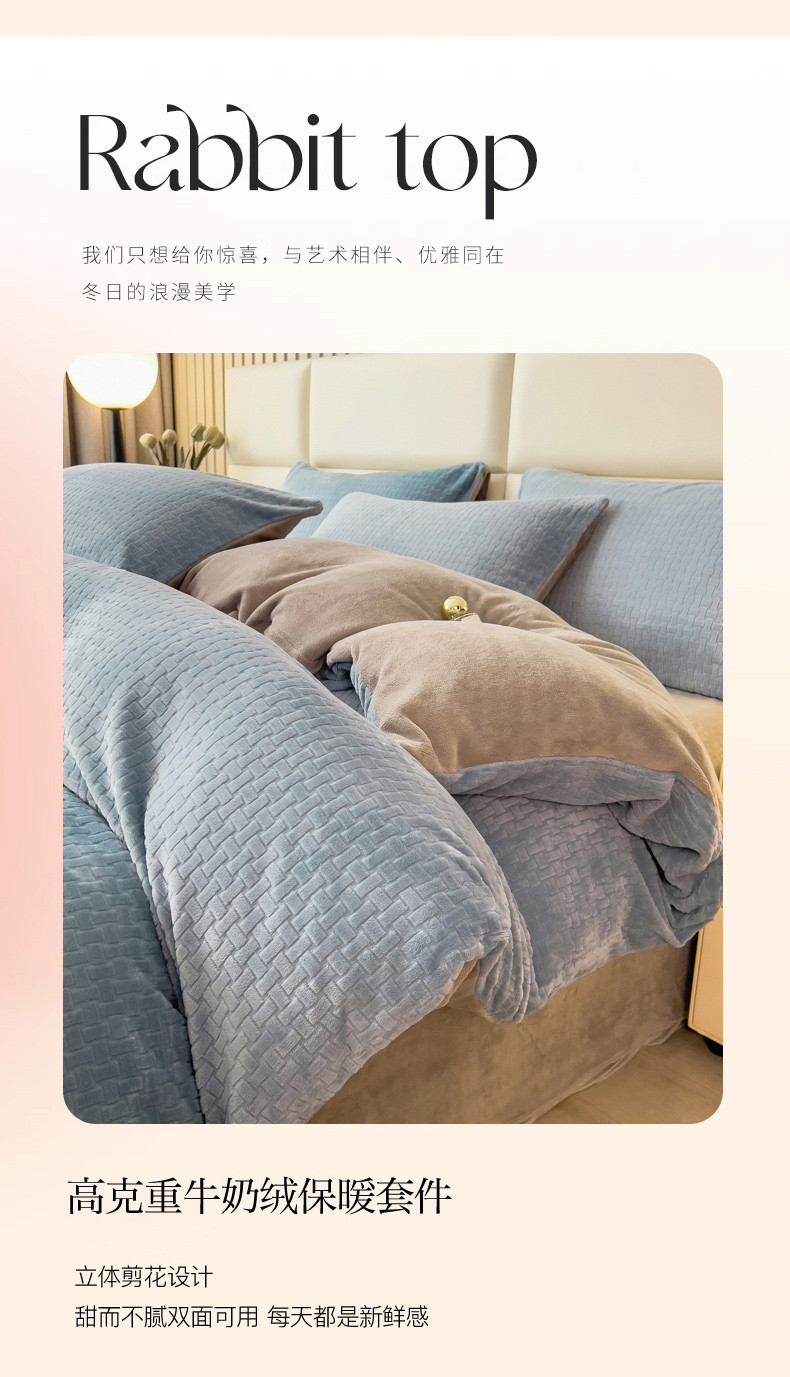 商品名称:印季 2024新款立体剪花牛奶绒保暖四件套-十字结 蓝灰-灰