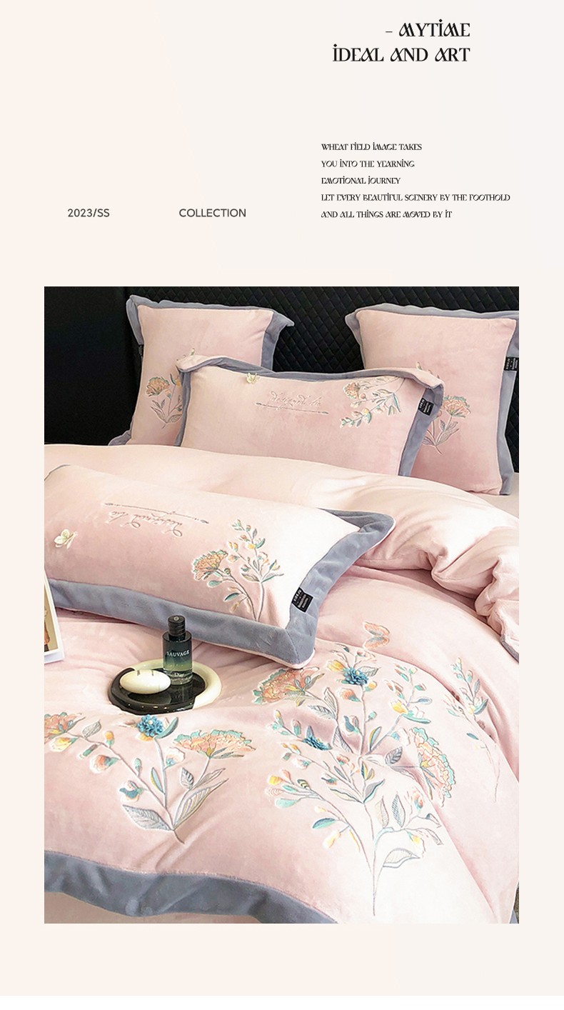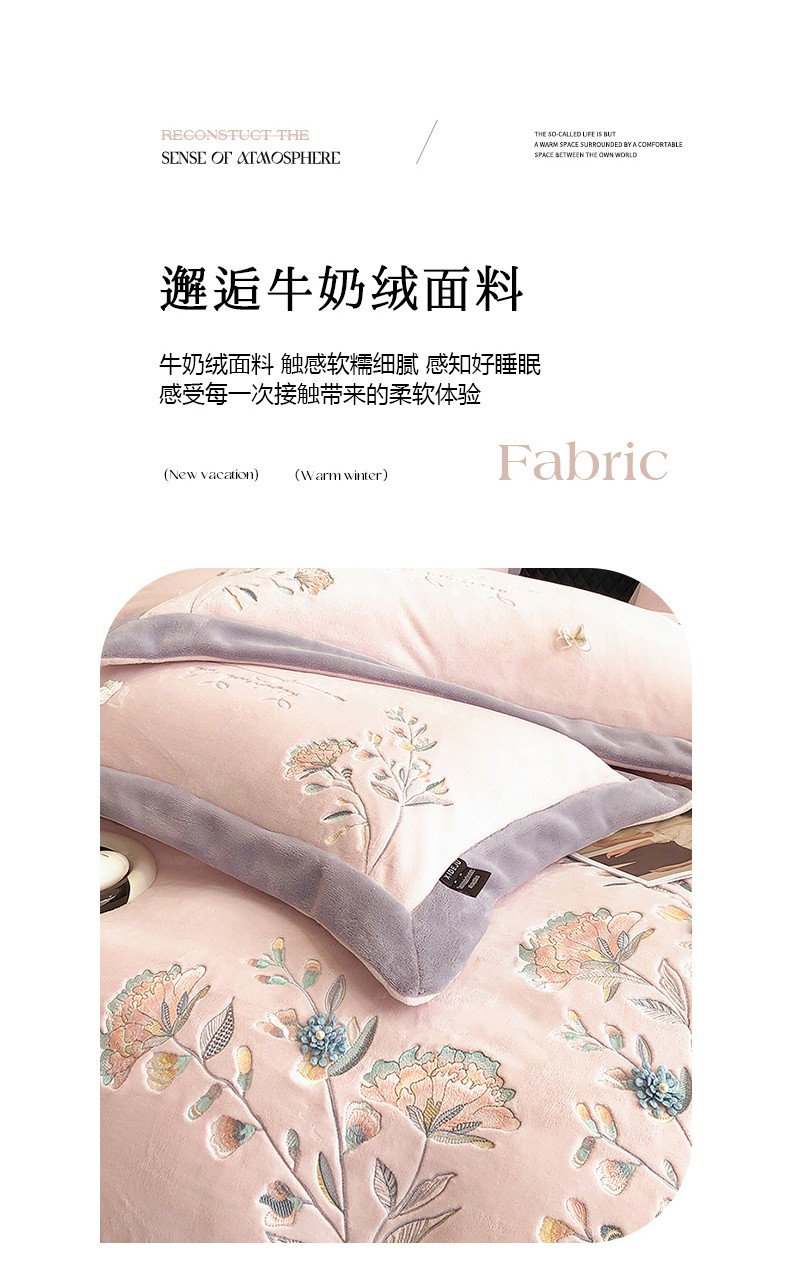 (总)品家居 2025新款5D雕花牛奶绒绣花大拼角四件套-岁月静好,粉色,蓝色,秋黄