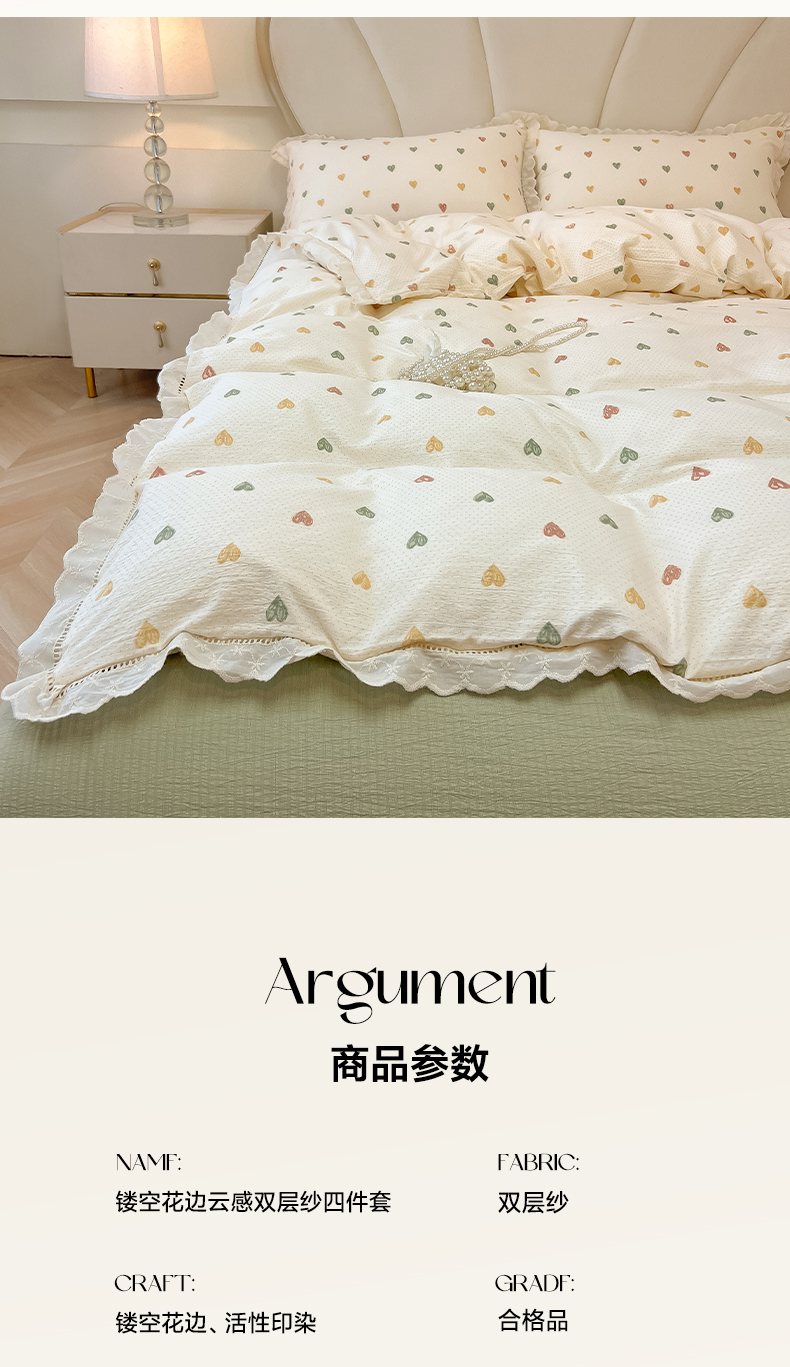 商品名称:(总)韩巢家纺 2025新款双层纱镂空花边被套直播热销款四件套(提供卖家秀)