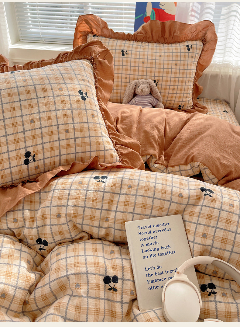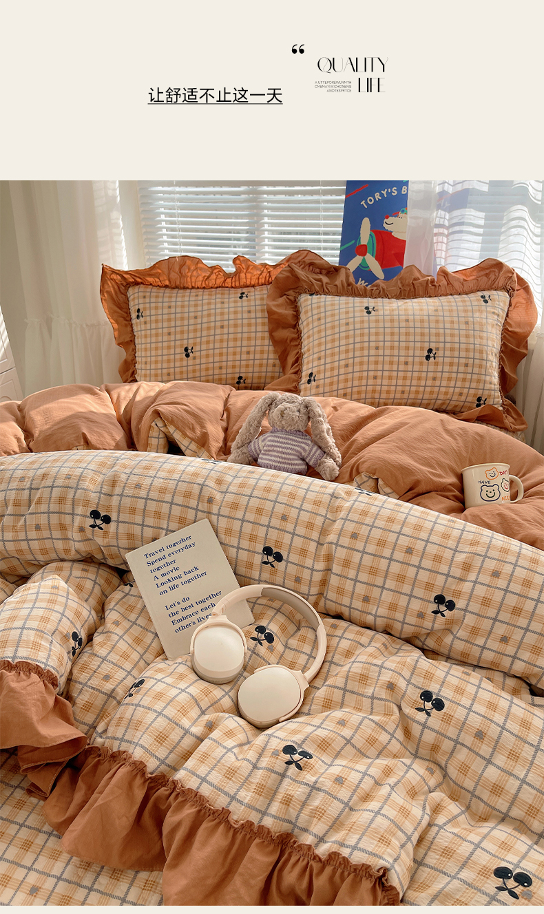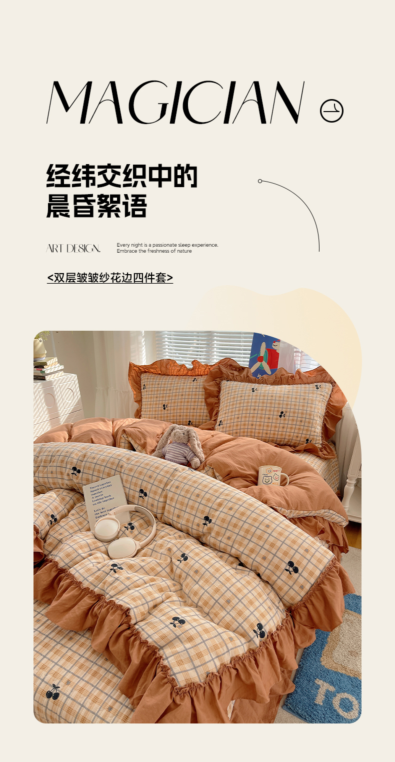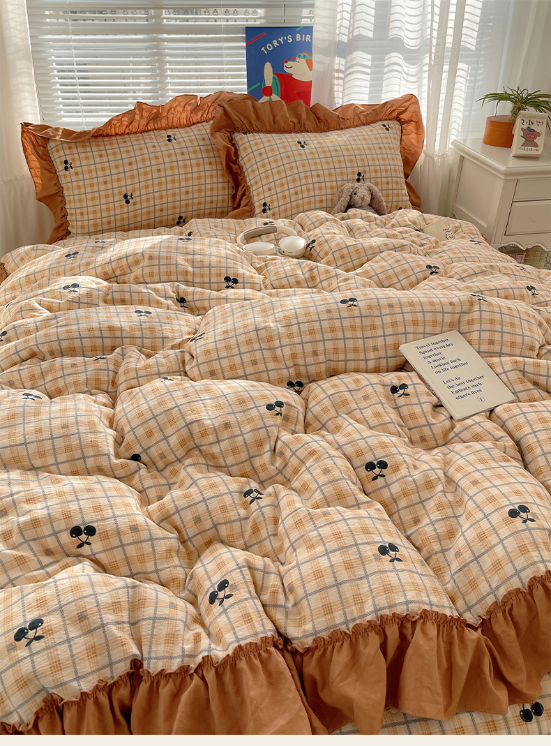 商品名称:韩都家居 2026新款云感双层纱床盖四件套 焦糖樱桃