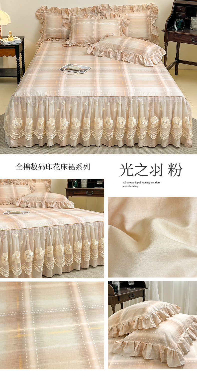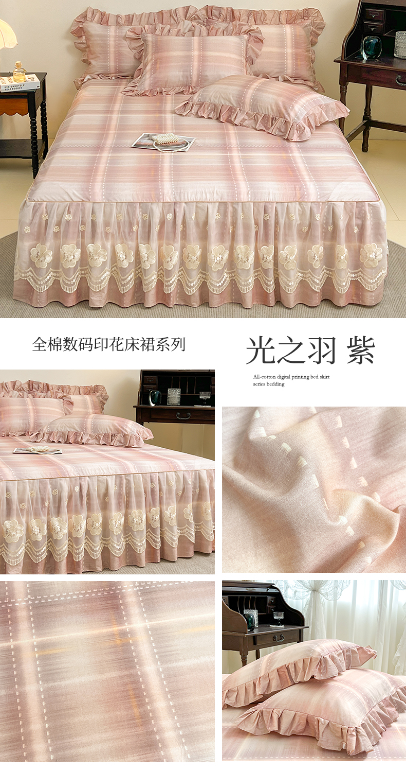 (总)宜凡家纺 2026新款全棉数码印花单层床裙格子系列单床裙三件套,光之羽 粉,光之羽 绿,光之羽 紫