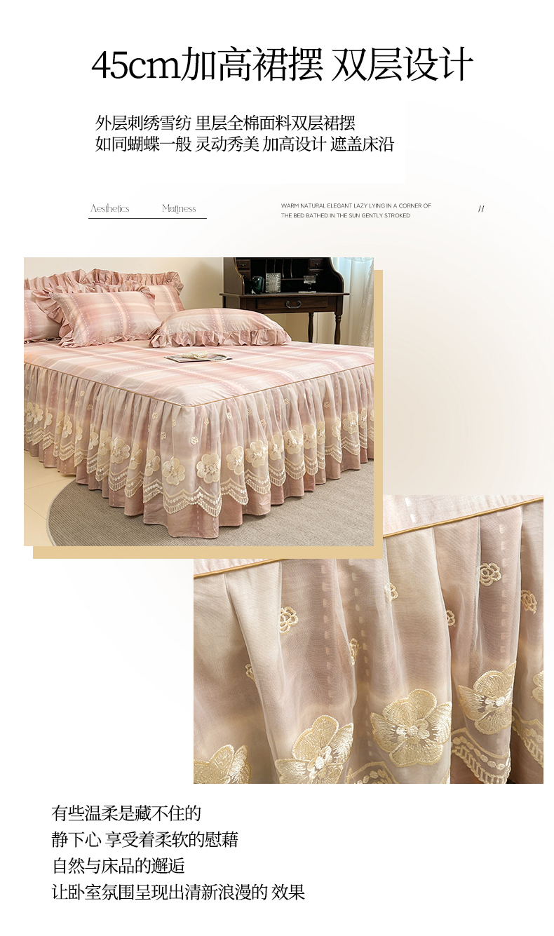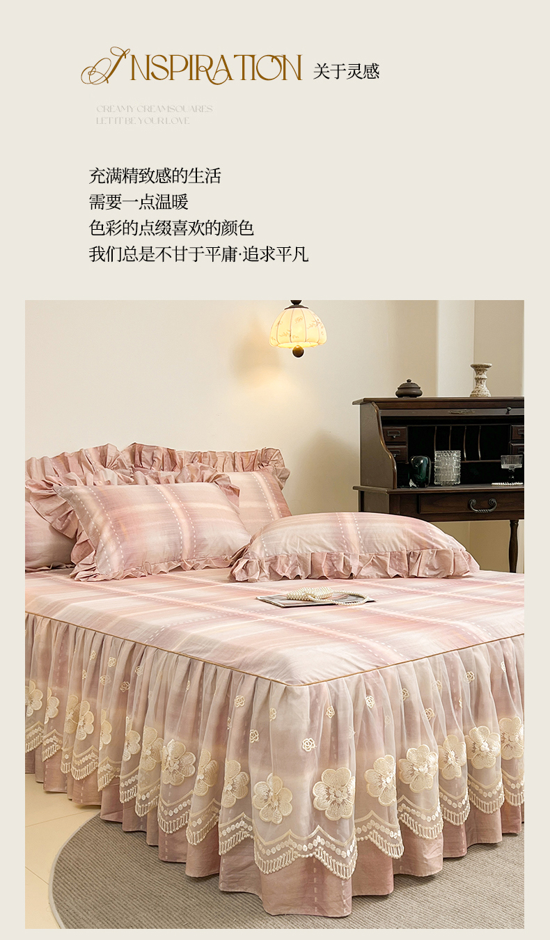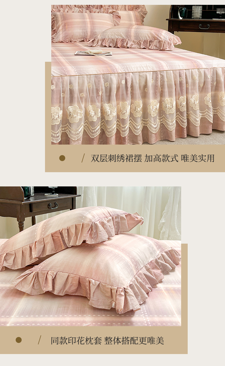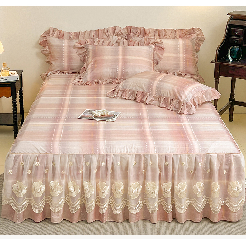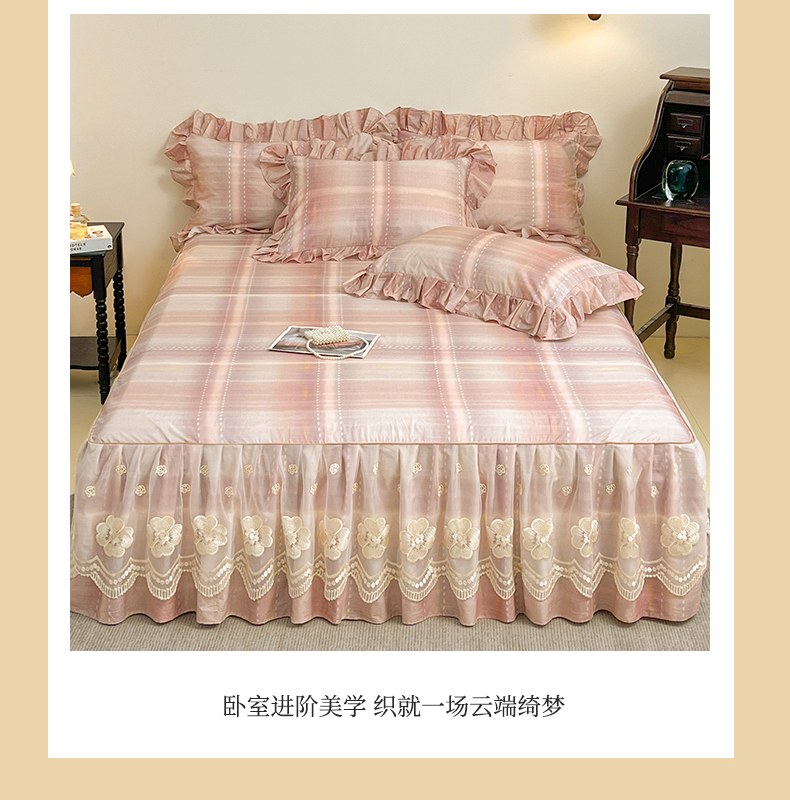 • 91家纺网 家纺一手货源 找家纺 (总)宜凡家纺  2026新款全棉数码印花单层床裙格子系列单床裙三件套,光之羽 粉,光之羽 绿,光之羽 紫