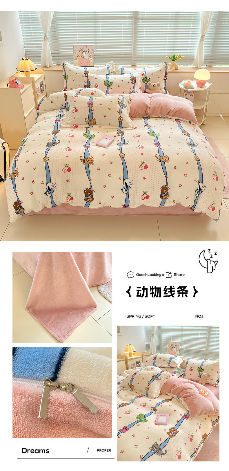 商品名称:2024新款A类AB版加厚保暖双面牛奶绒印花四件套--小清新系列 动物线条