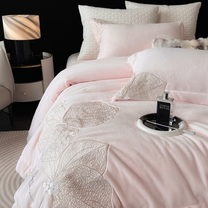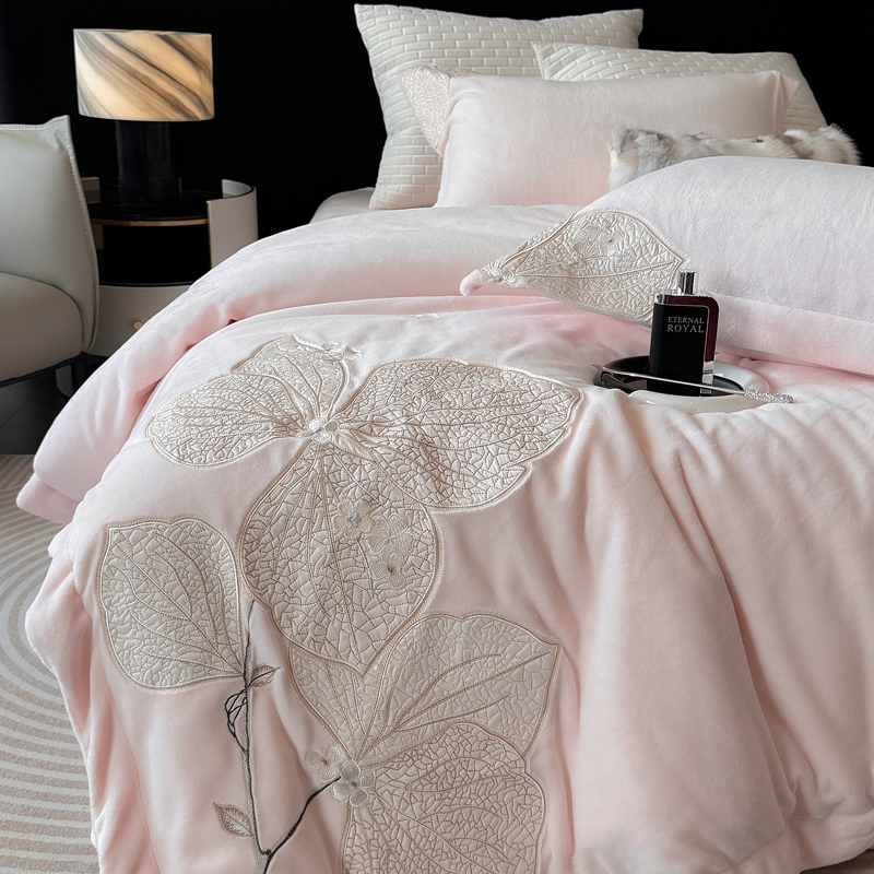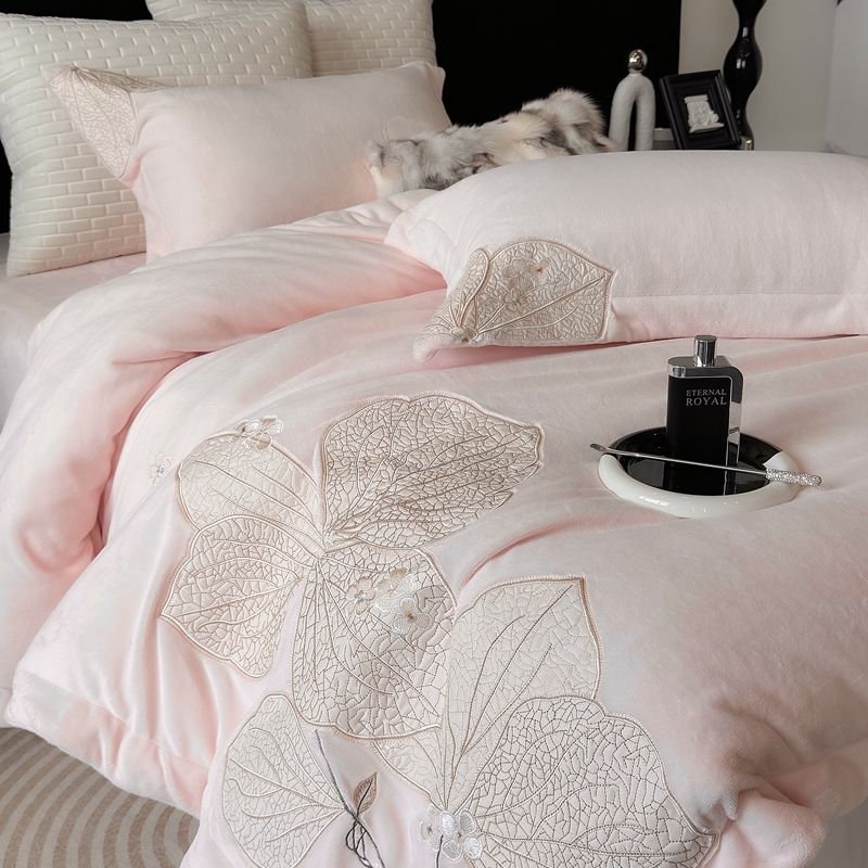 商品名称:沐白家居 2024新款全消光高克重锦芙牛奶绒绣花四件套-香雪兰 香雪兰-蔷薇粉