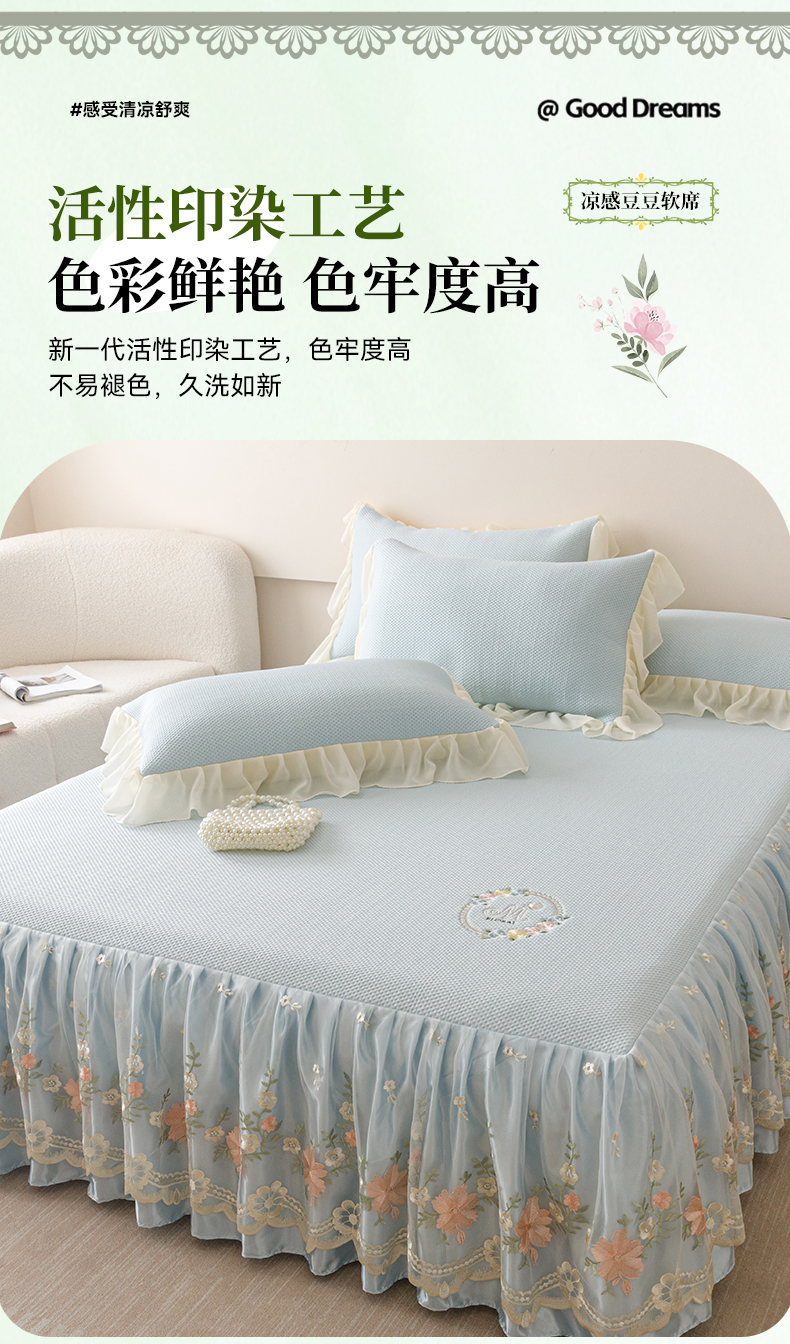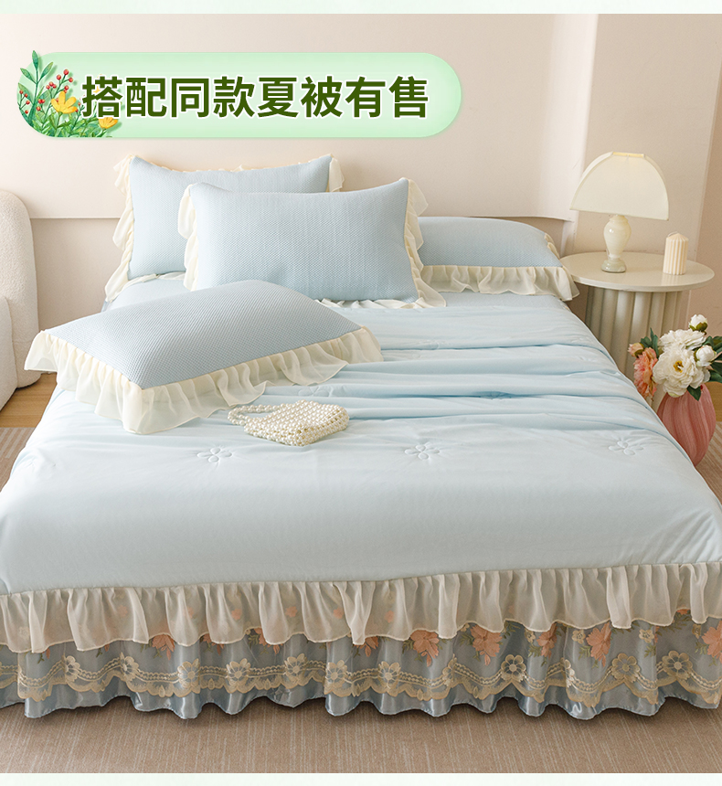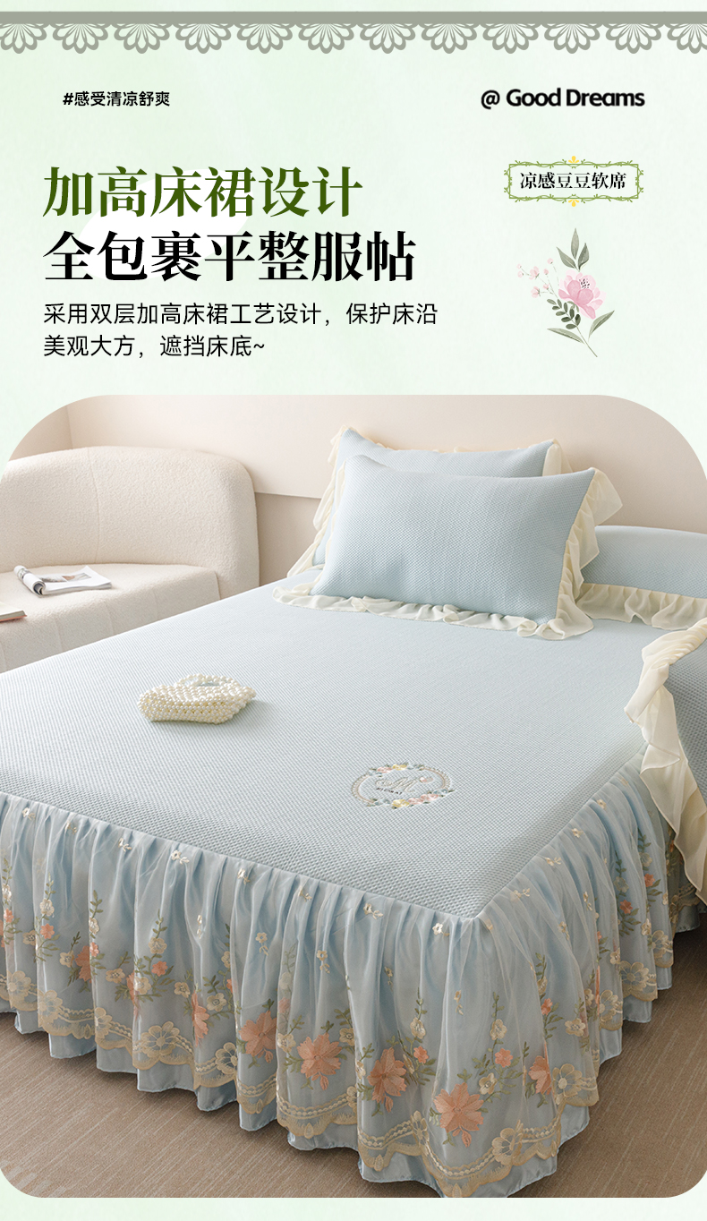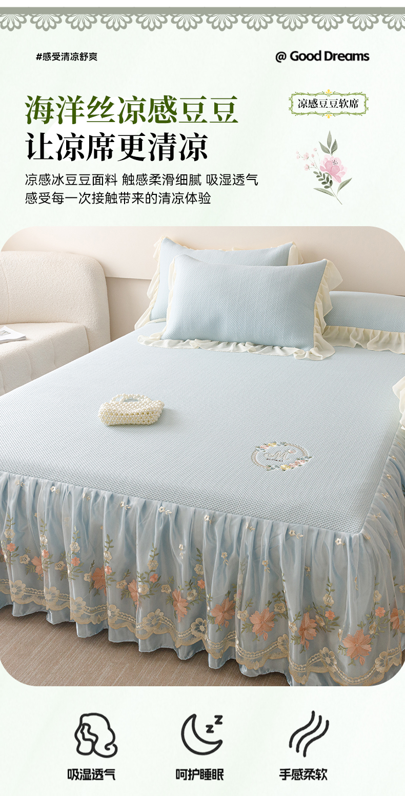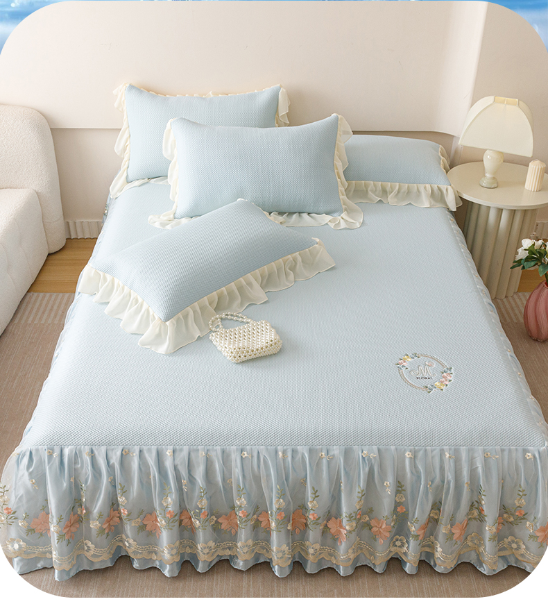 好儿喜家纺2025新款海洋丝凉感豆豆床裙凉席-花蜜 浅蓝