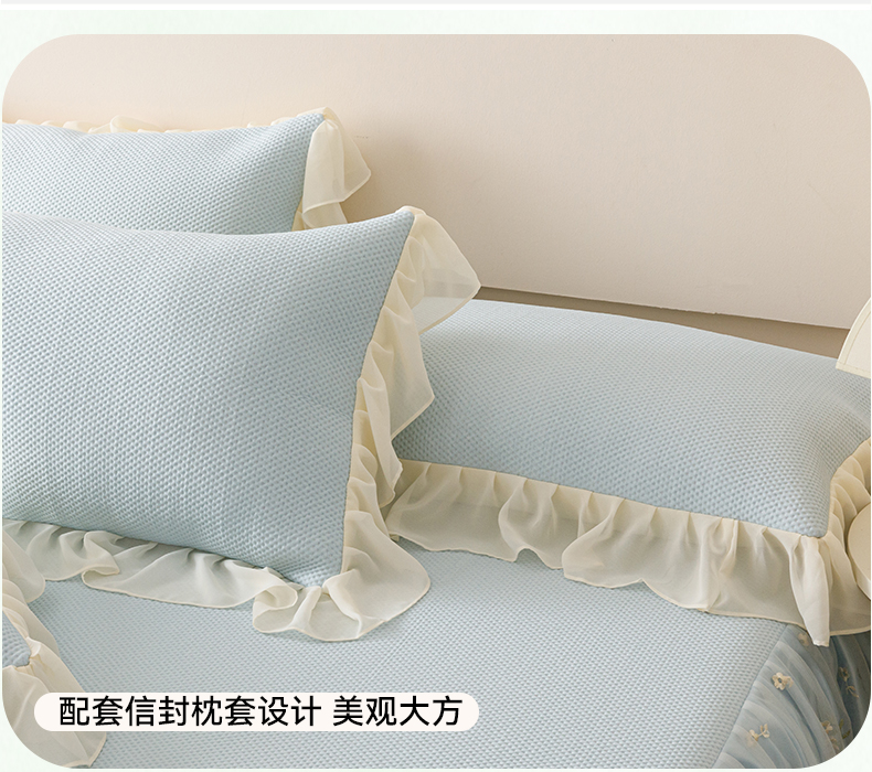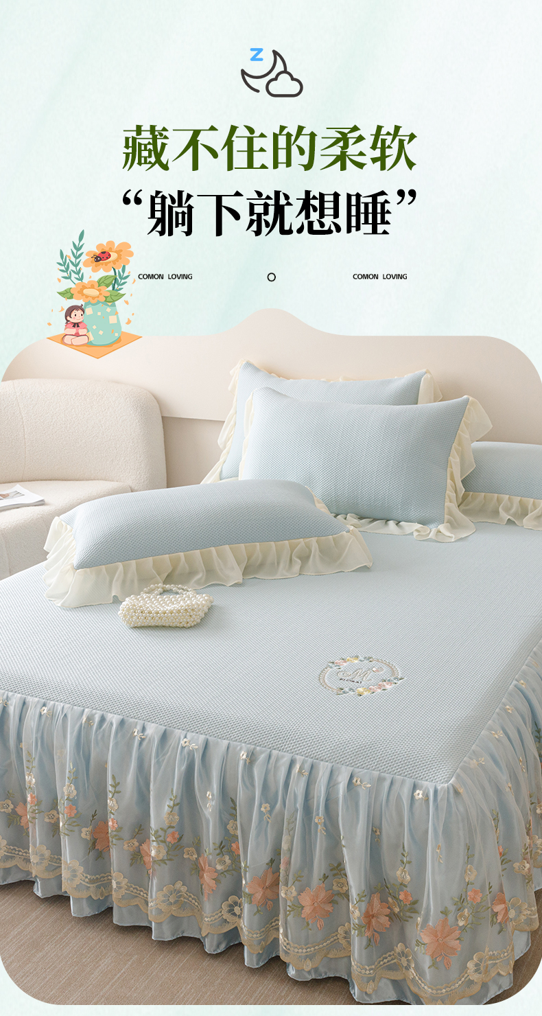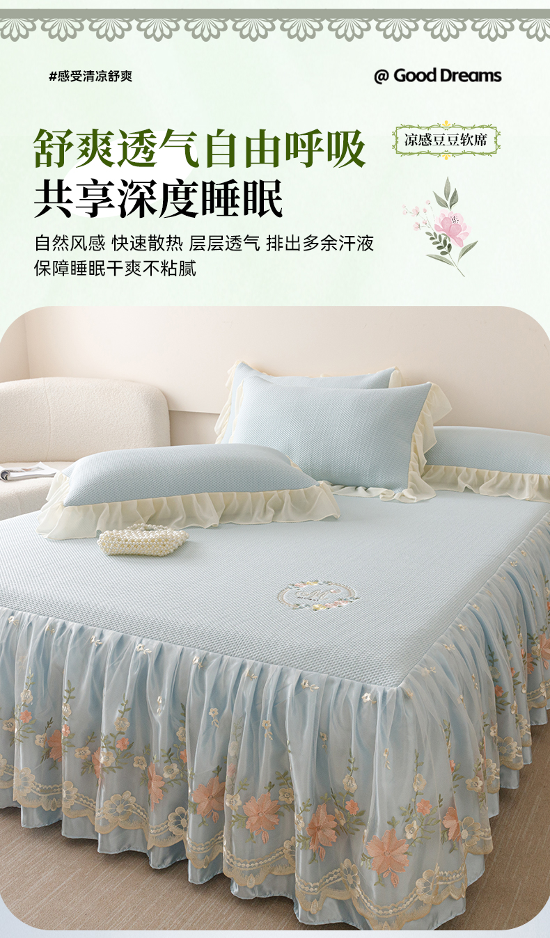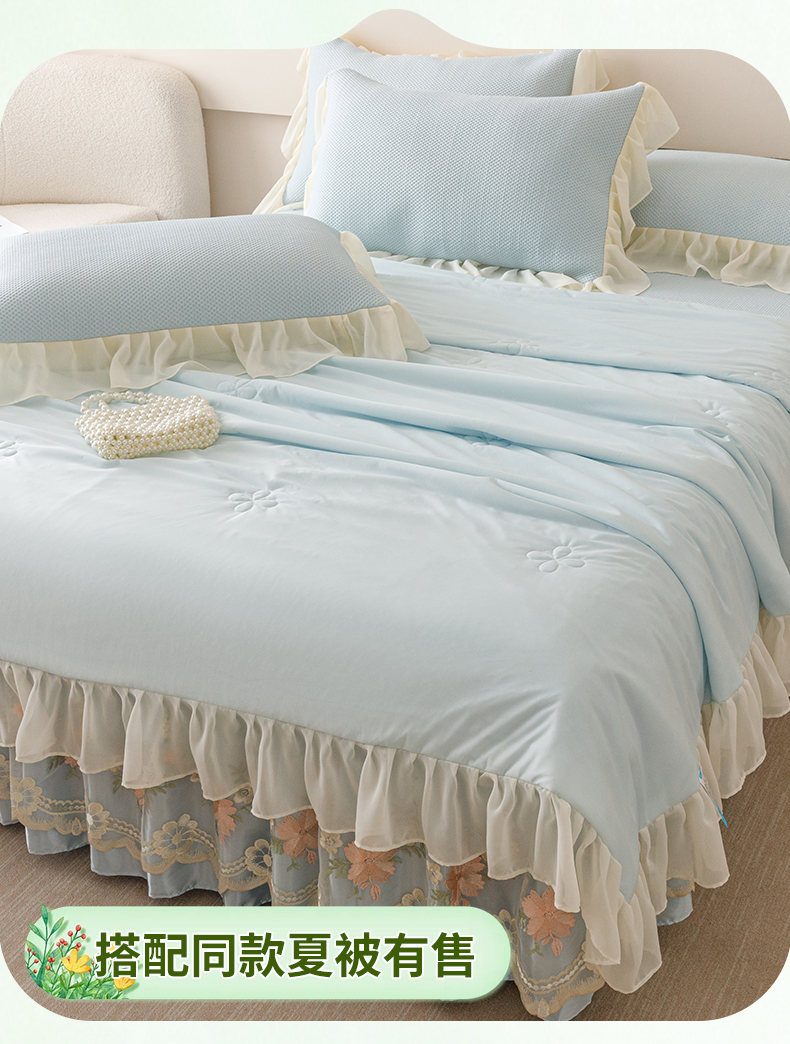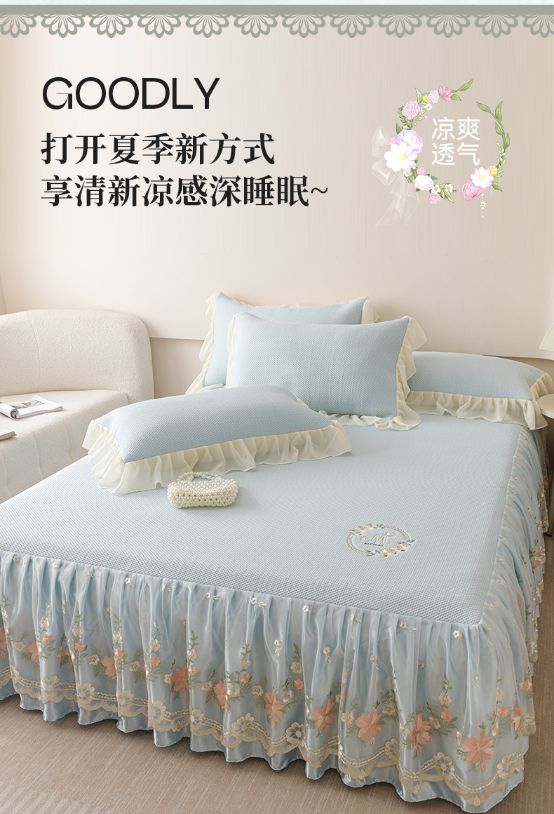 好儿喜家纺2025新款海洋丝凉感豆豆床裙凉席-花蜜 浅蓝