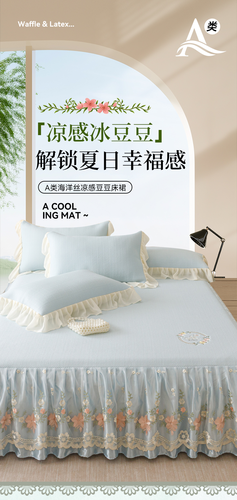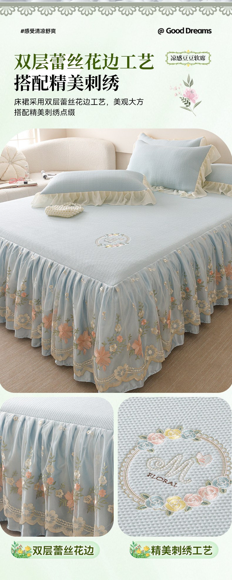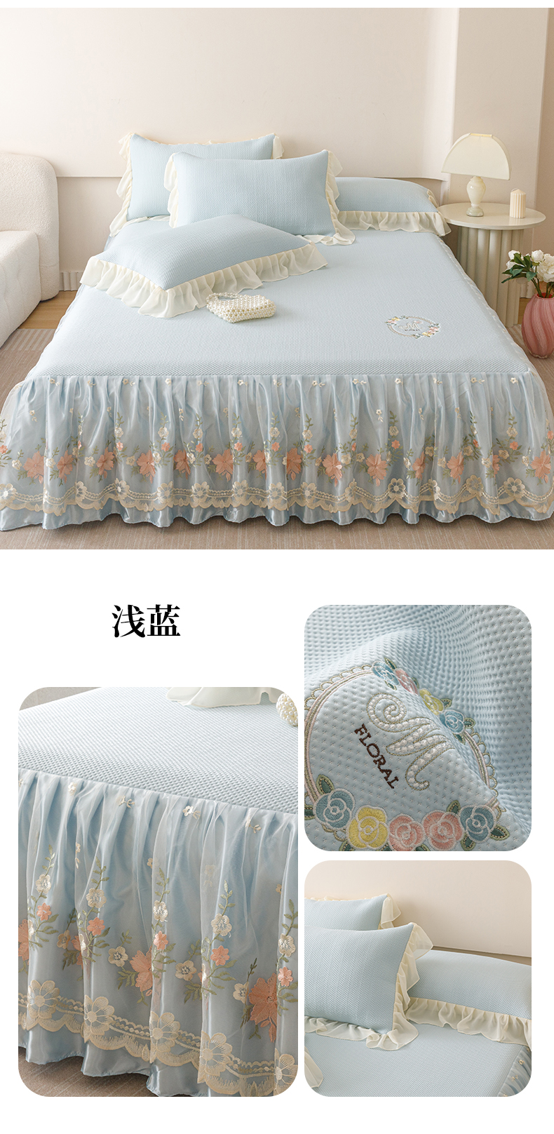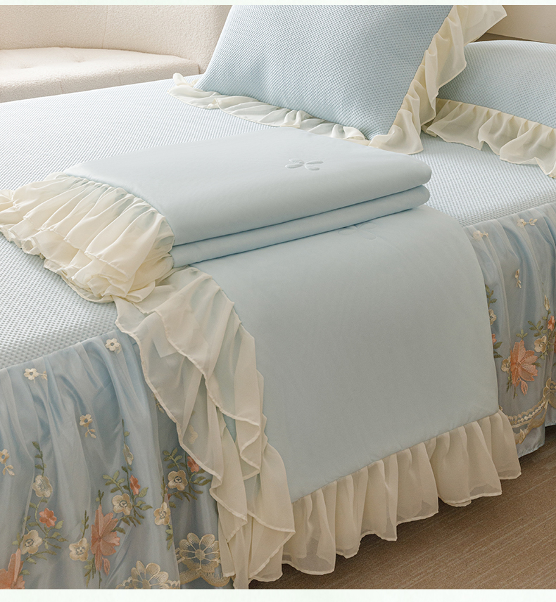 好儿喜家纺2025新款海洋丝凉感豆豆床裙凉席-花蜜 浅蓝
