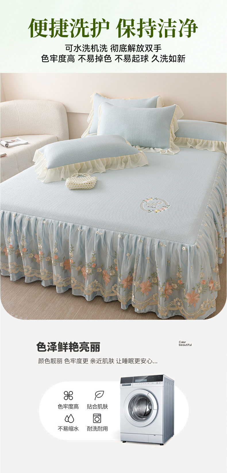 • 91家纺网 家纺一手货源 找家纺 好儿喜家纺2025新款海洋丝凉感豆豆床裙凉席-花蜜 浅蓝