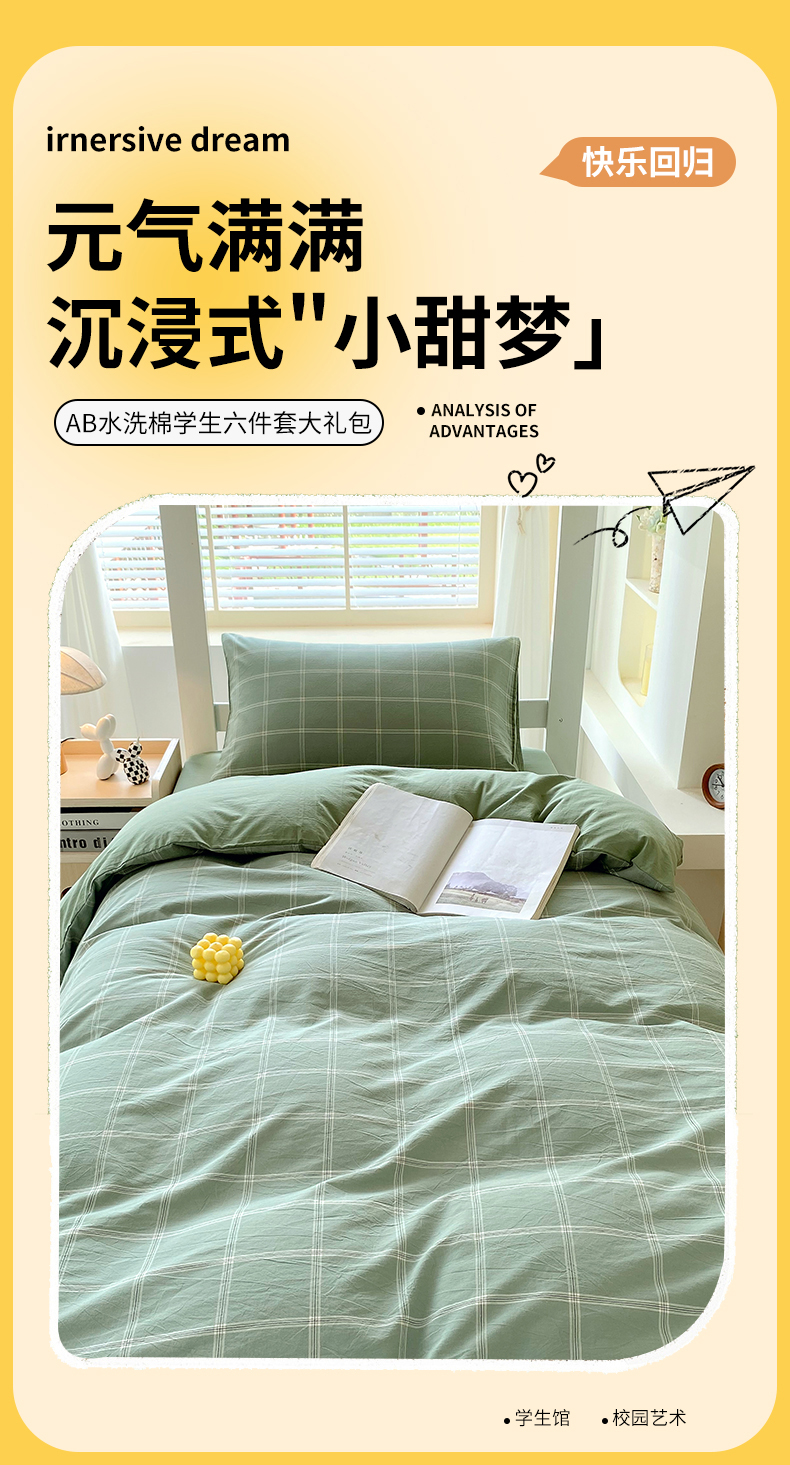 当前位置: 91家纺网 > 商品网购 > 床品套件 > 四件套 > 全棉普通四件套 > 春皖家纺 2025春夏新款AB版全棉纯棉色织水洗棉学生三件套六件套 素雅-韵绿