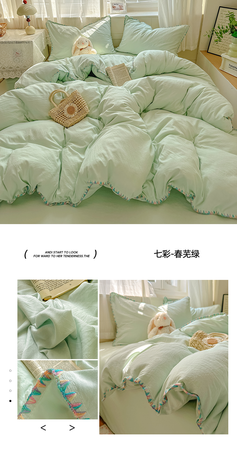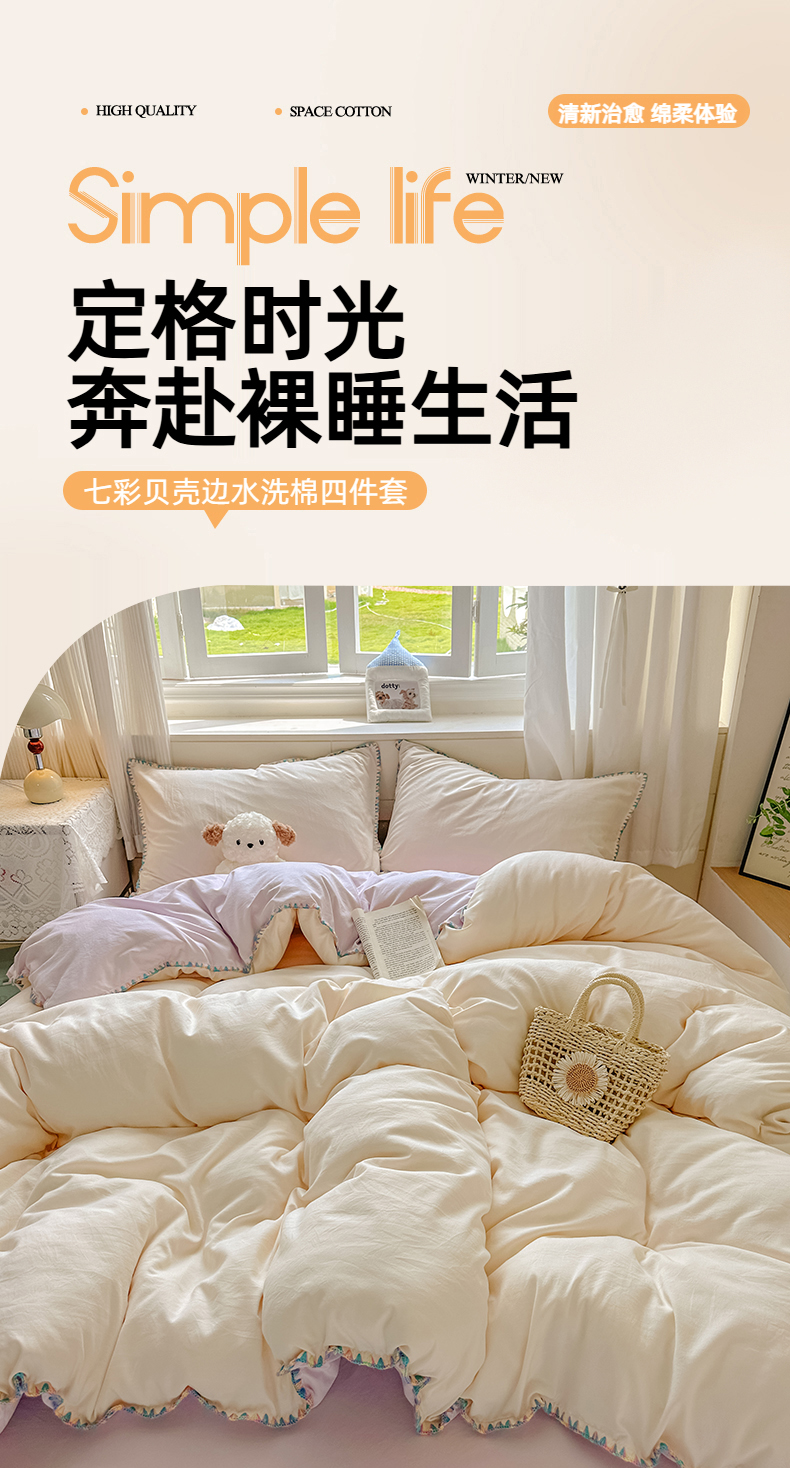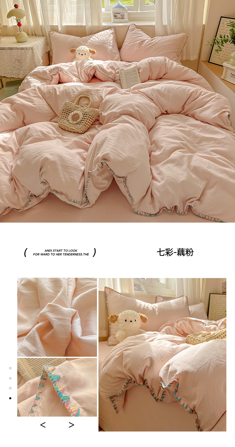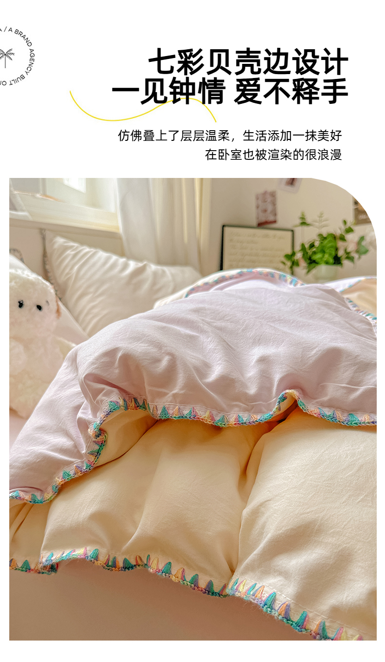 当前位置: 91家纺网 > 商品网购 > 床品套件 > 四件套 > 水洗棉四件套 > 冕悠家纺 2025新款A类七彩贝壳边水洗棉四件套 七彩-暮山紫芝士粉