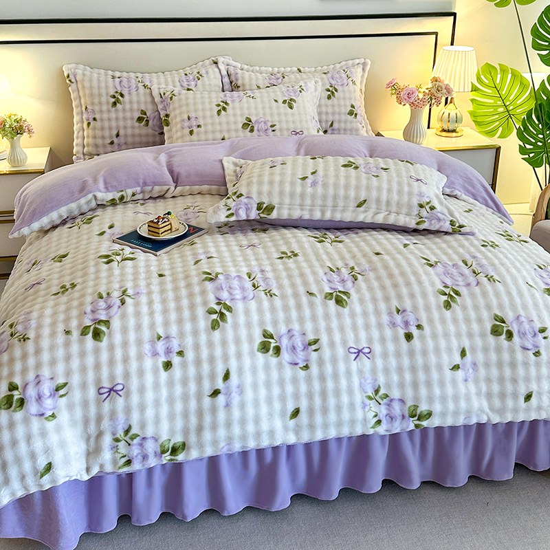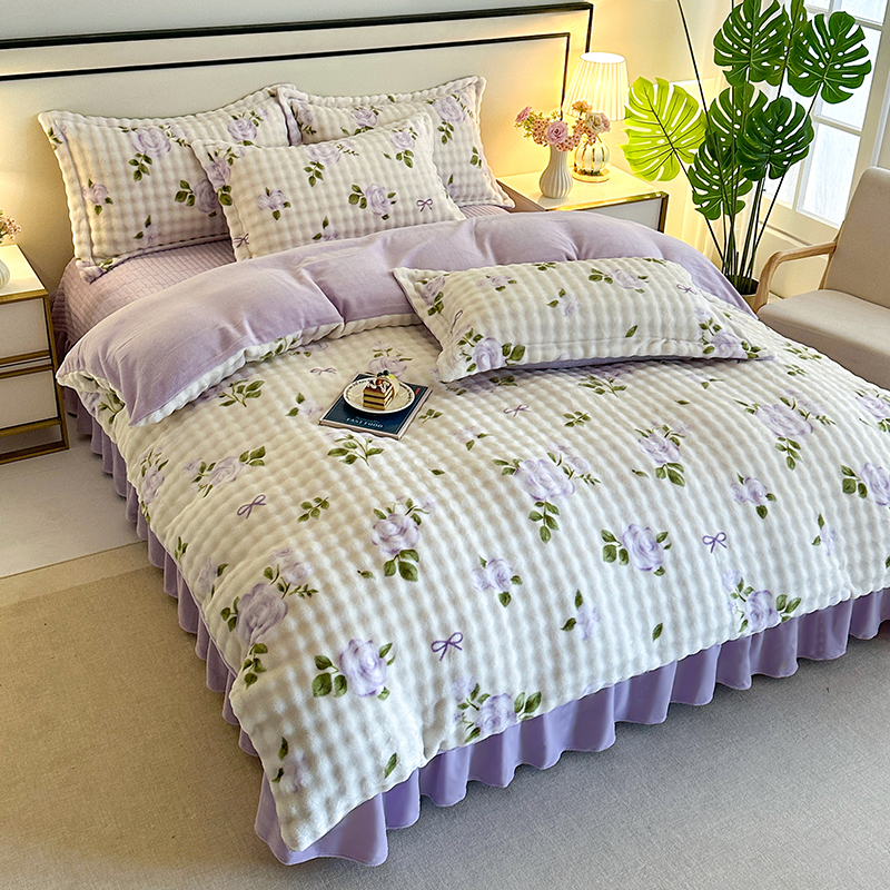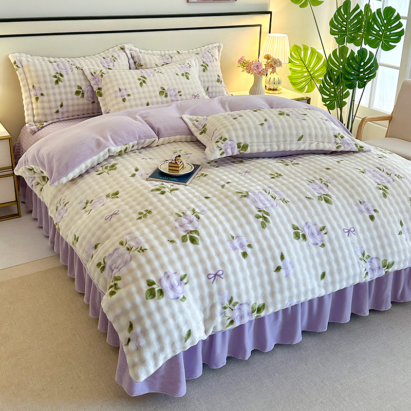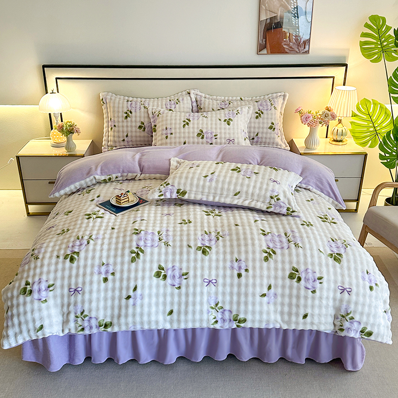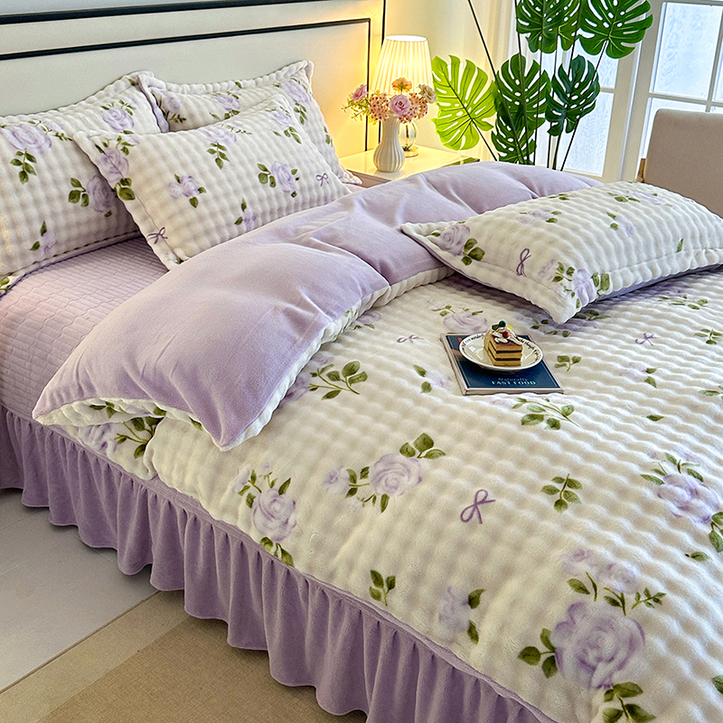 富缦庭 2025新款泡泡牛奶绒床盖款四件套 紫色蝴蝶结