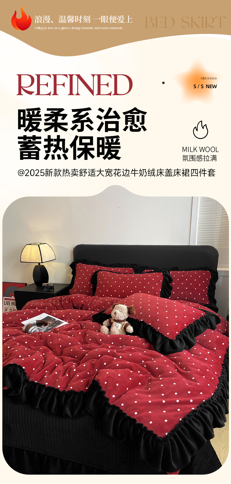 当前位置: 91家纺网 > 商品网购 > 床品套件 > 四件套 > 牛奶绒四件套 > 富米莱(原臻工厂) 2025新款热卖舒适大宽花边牛奶绒床盖床裙四件套 爆款大宽花边-花季玫瑰