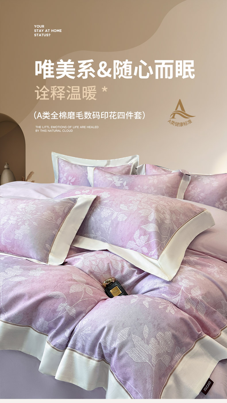 商品名称: 2025冬季热款A类加厚磨毛四件套全棉纯棉数码印花保暖被套床单高端轻奢风床笠床上用品 瑾姝-黛紫