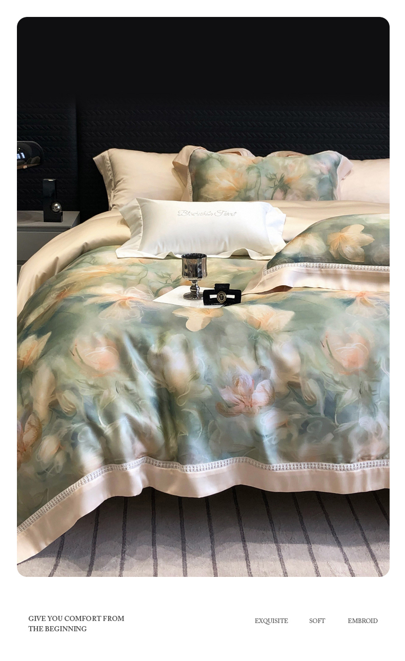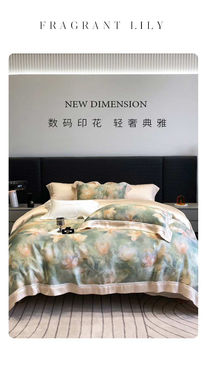 黑白森林2024款 60S支兰精天丝数码印花四件套,朝颜,木槿,玉茗,春浅,京墨,半夏,丹若,繁缕,青黛,德琳-粉,德琳-绿,蒂娜-灰,蒂娜-紫,慧莉-粉,慧莉-绿,欧瑞,夏夜