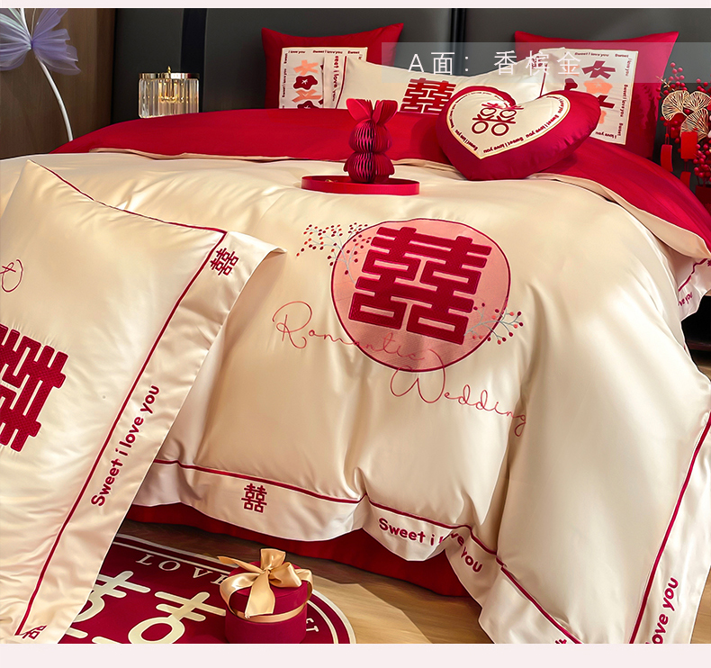 (总)甜咪咪婚庆 2026新款婚庆公主风小红书爆款50s双股100支长绒棉全棉四件套多件套床单床盖,罗曼蒂克 红,罗曼蒂克 金,马上有囍,星月公主