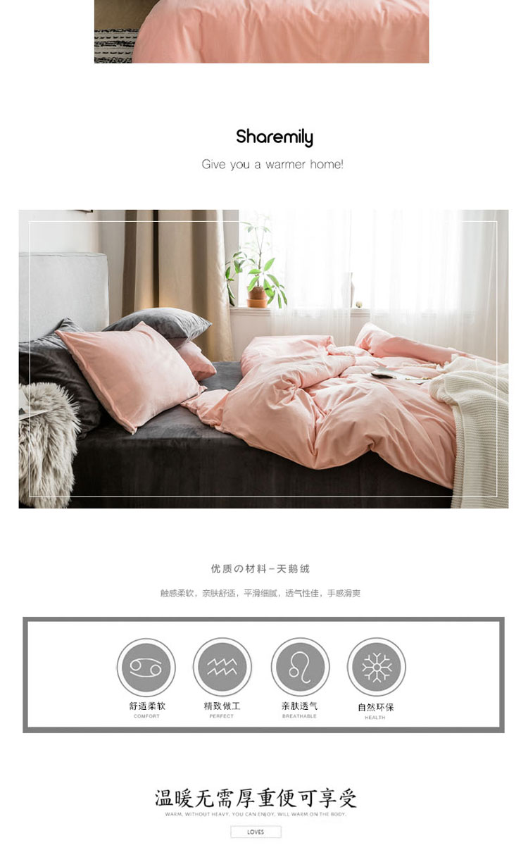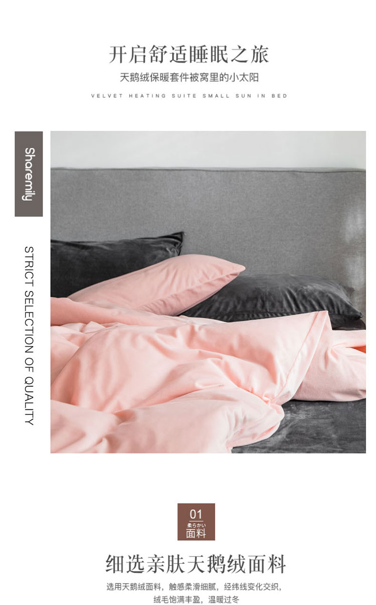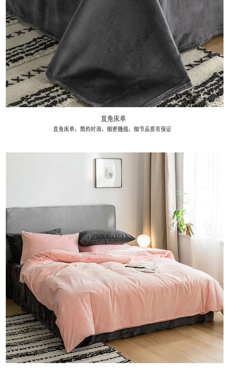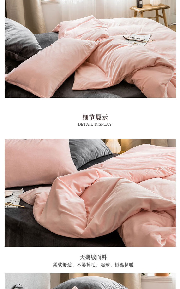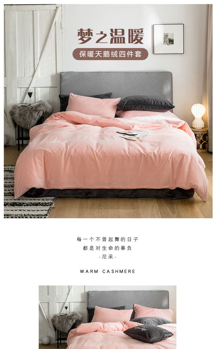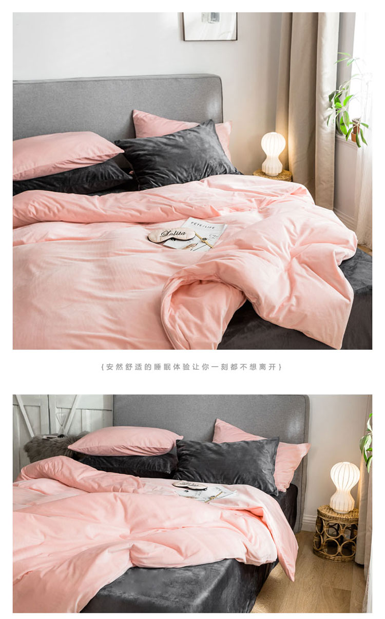商品名称:梦家居 2019韩国简约素色天鹅绒四件套 浅粉搭深灰