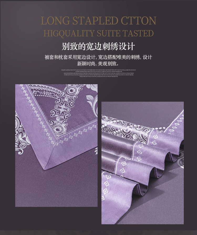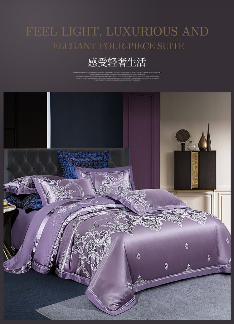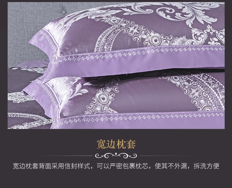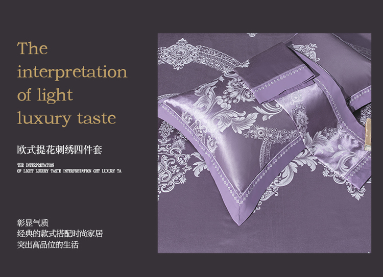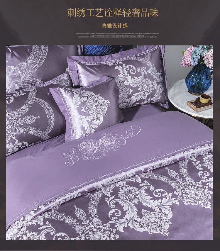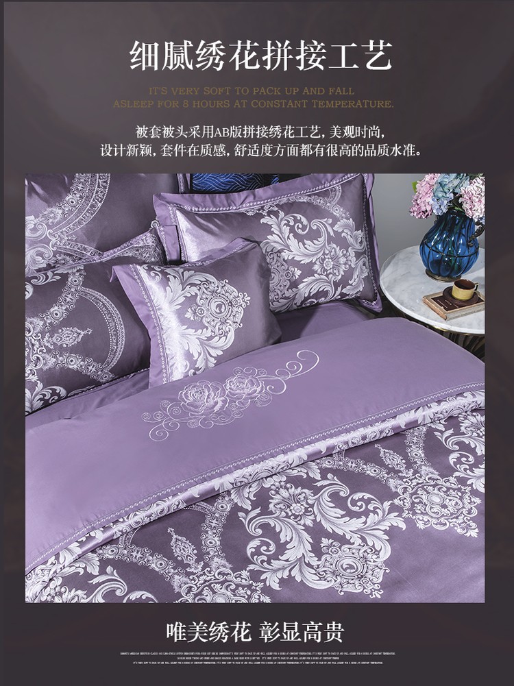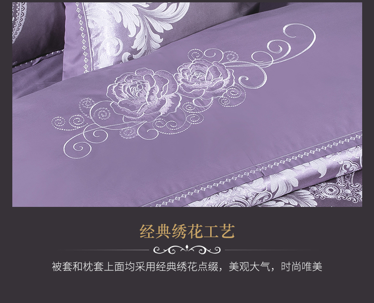 柔觉家纺 天丝刺绣贡缎提花全棉四件套,卡曼时尚-粉紫