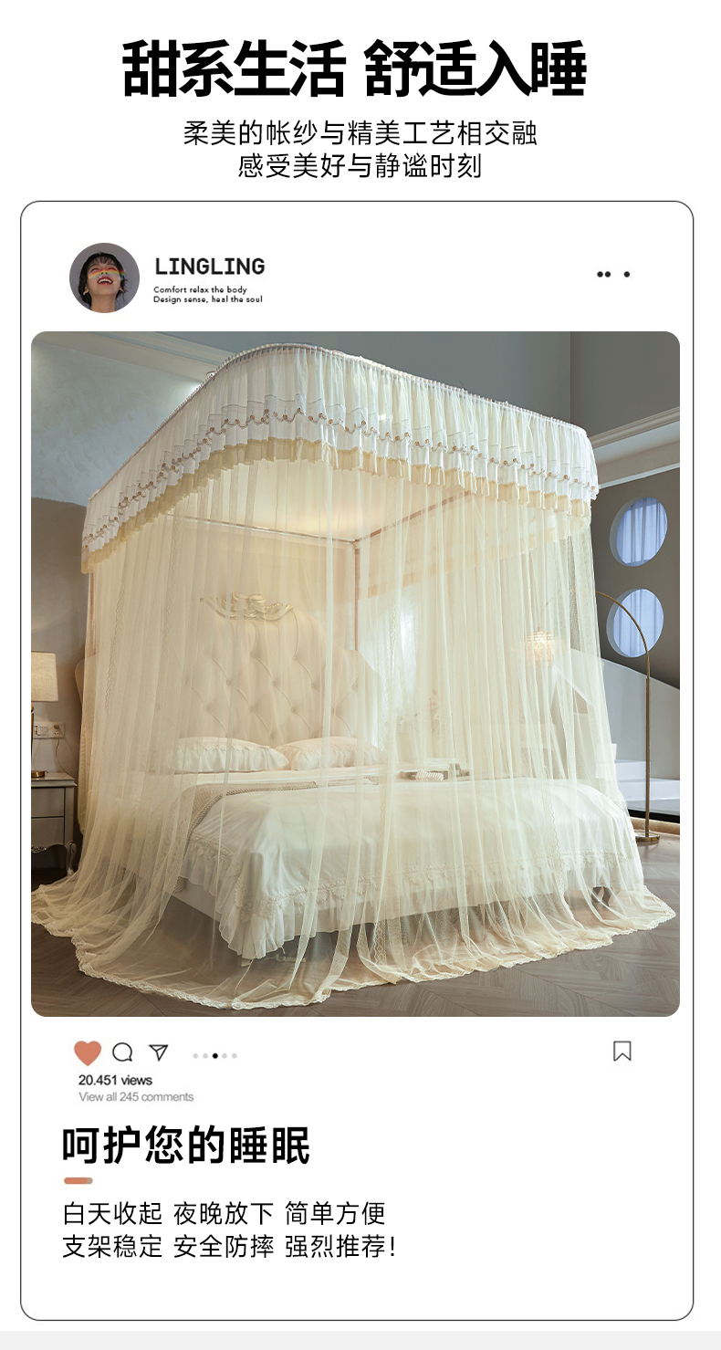 (总)2025新款双层花边全包围床笠款三开门蚊帐-幽梦星辰,奶黄,藕玉,颜淡蓝