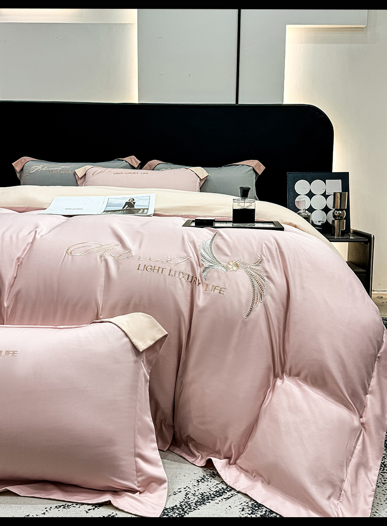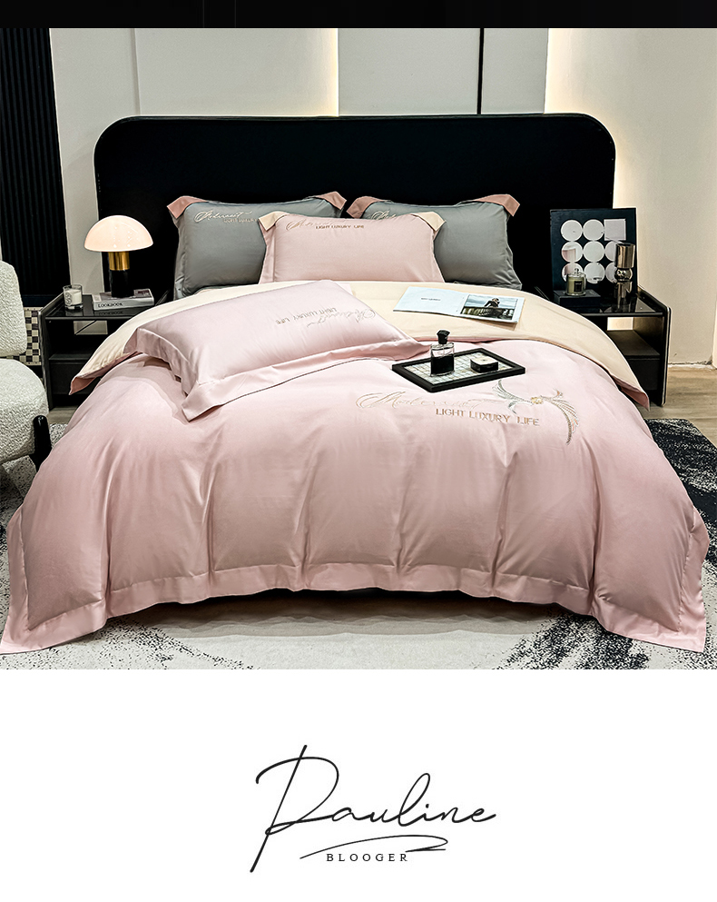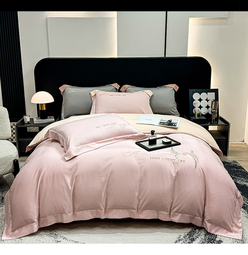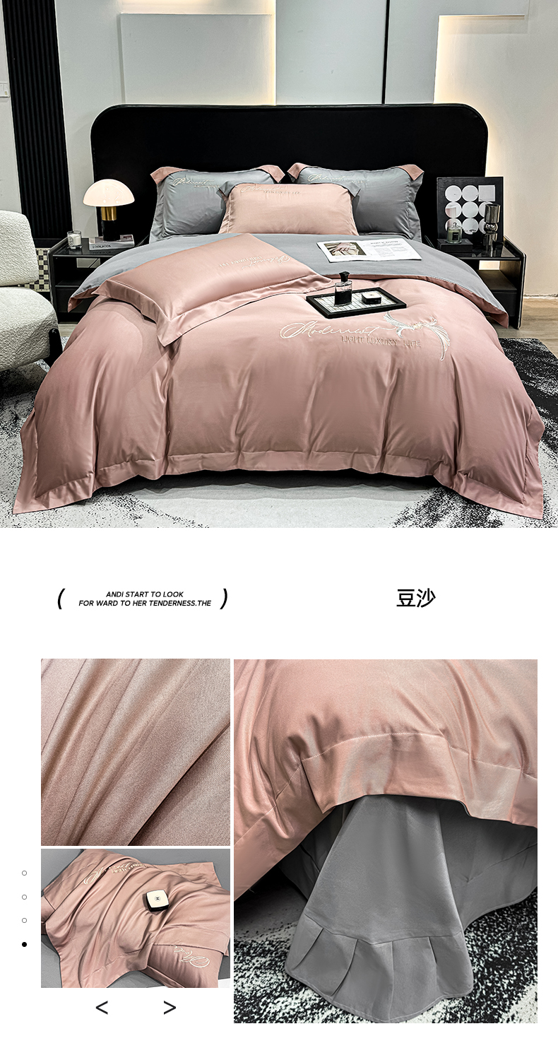 悦织湾家纺 亲肤120克水洗棉磨毛刺绣纯色四件套2025新款轻奢韩版公主风精致床上用品绣花4件套 宽境粉玉