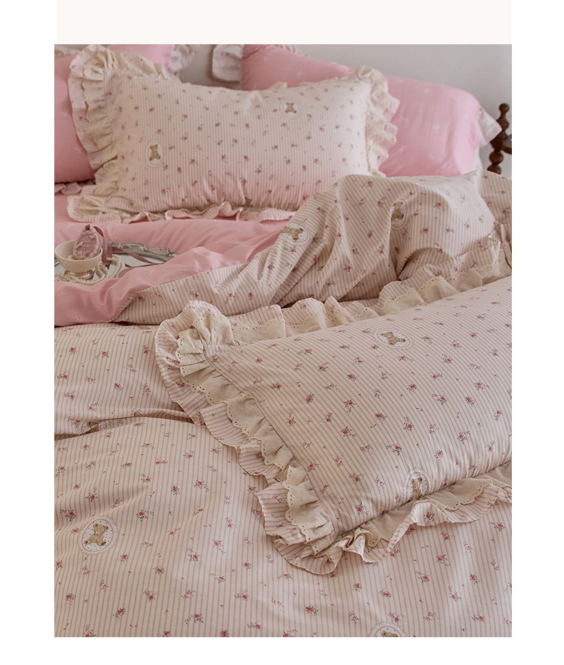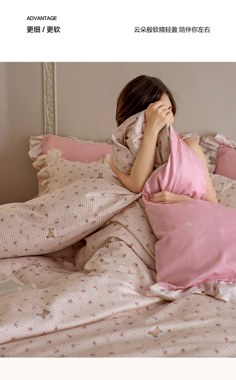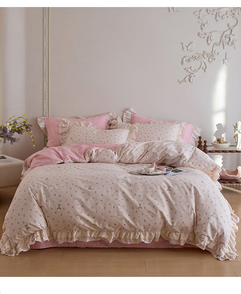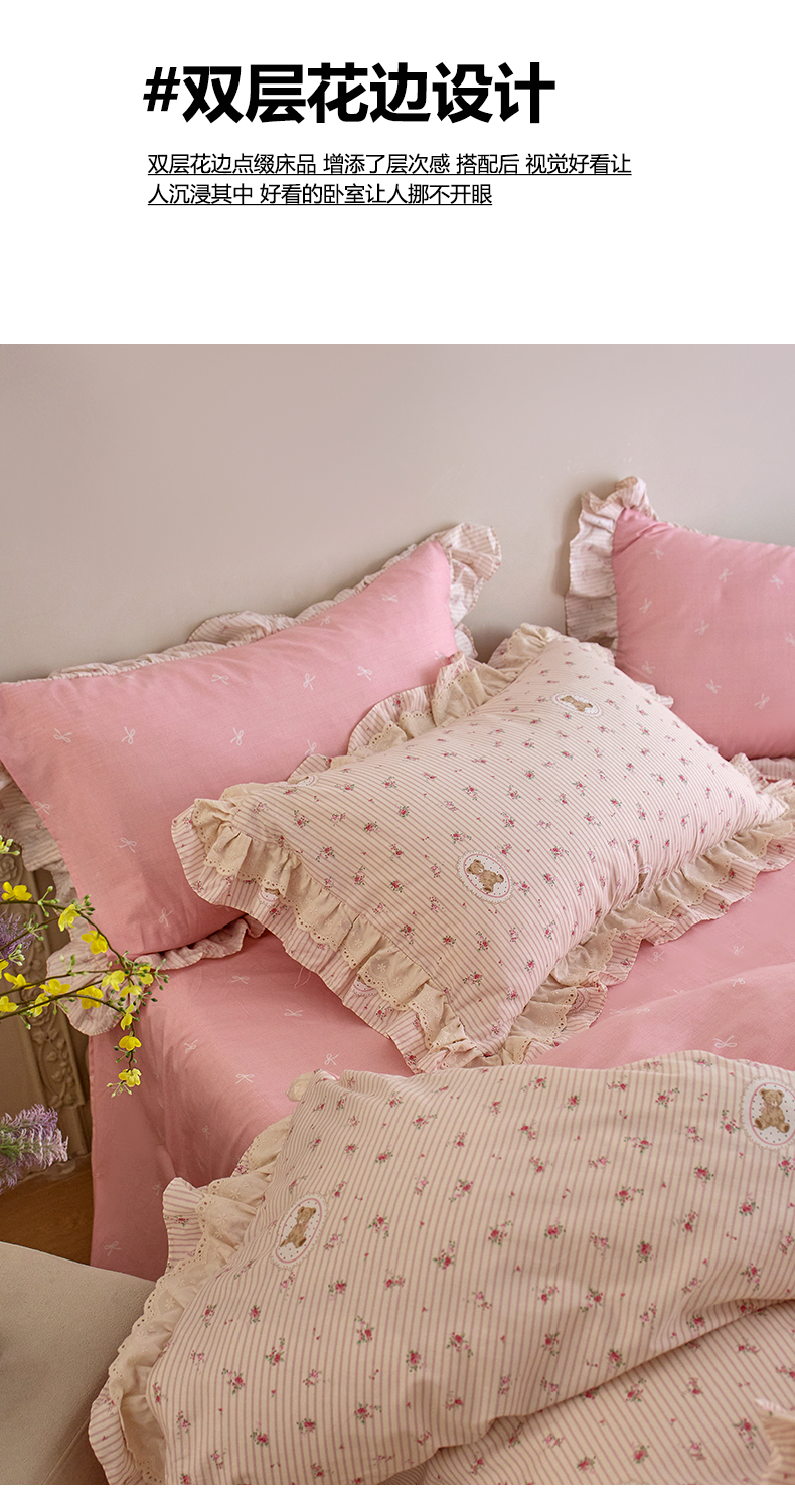 清雅福 2025春夏新品全棉13372法式双层花边系列四件套 萌熊乐园
