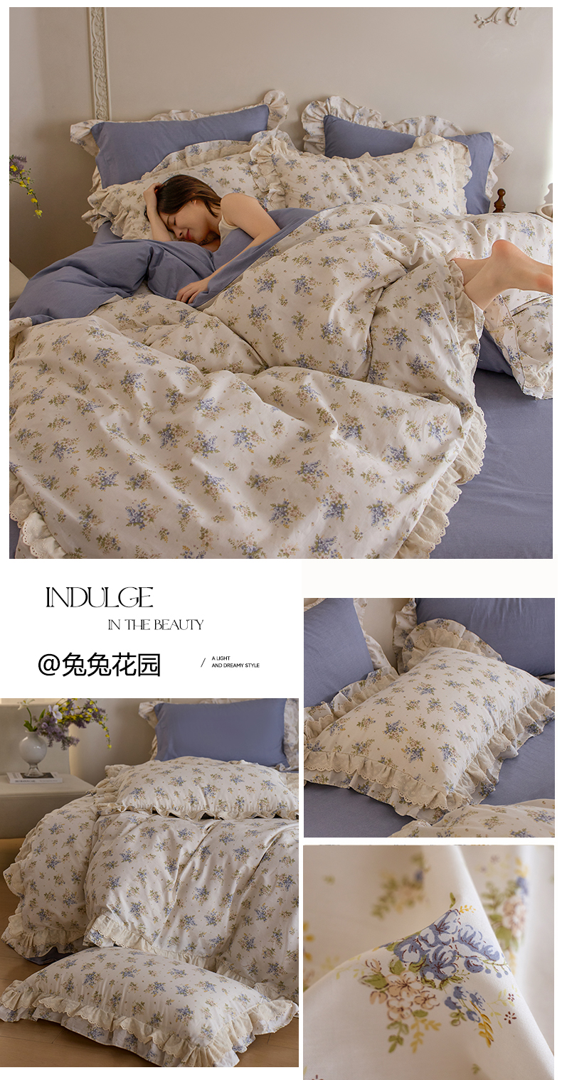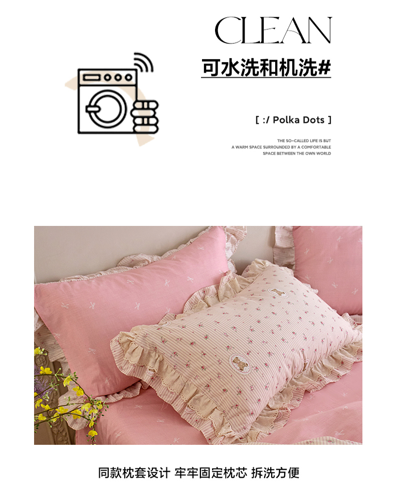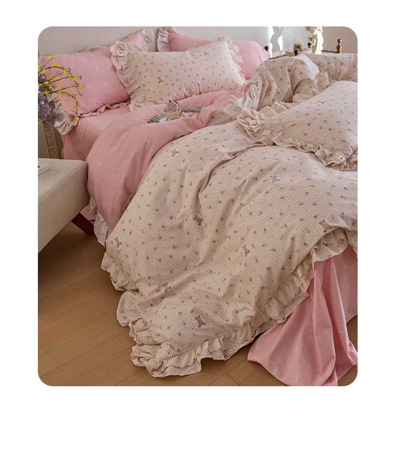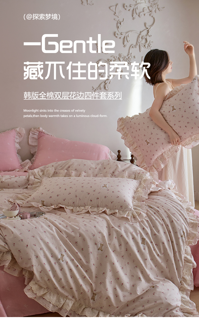 清雅福 2025春夏新品全棉13372法式双层花边系列四件套 萌熊乐园