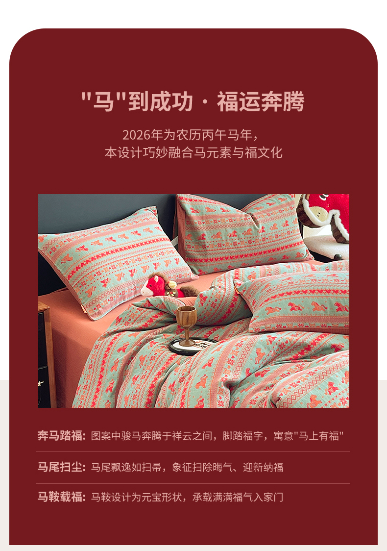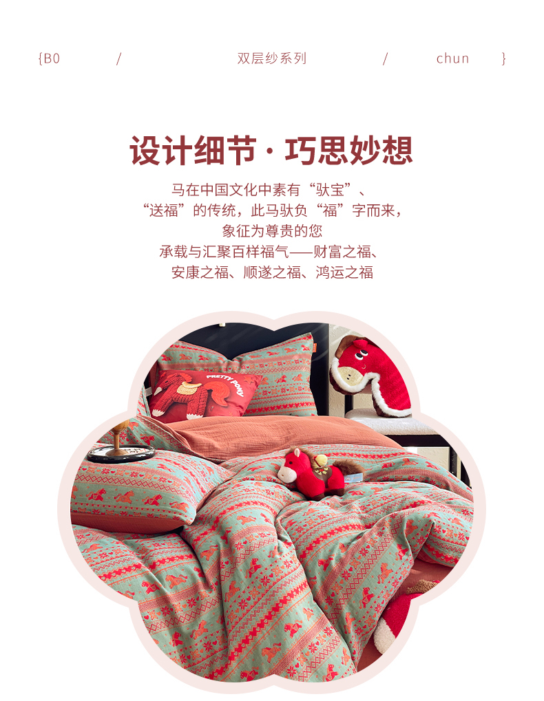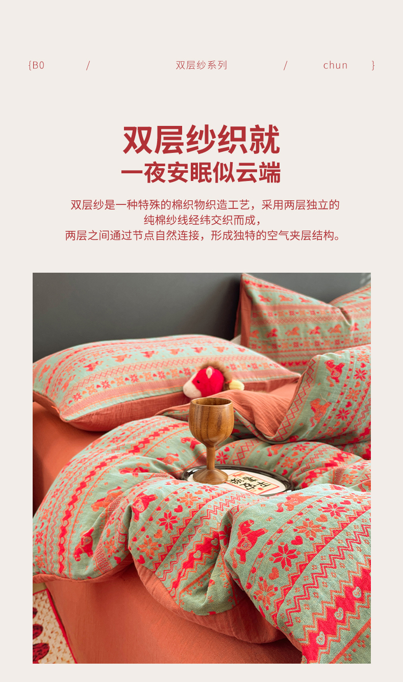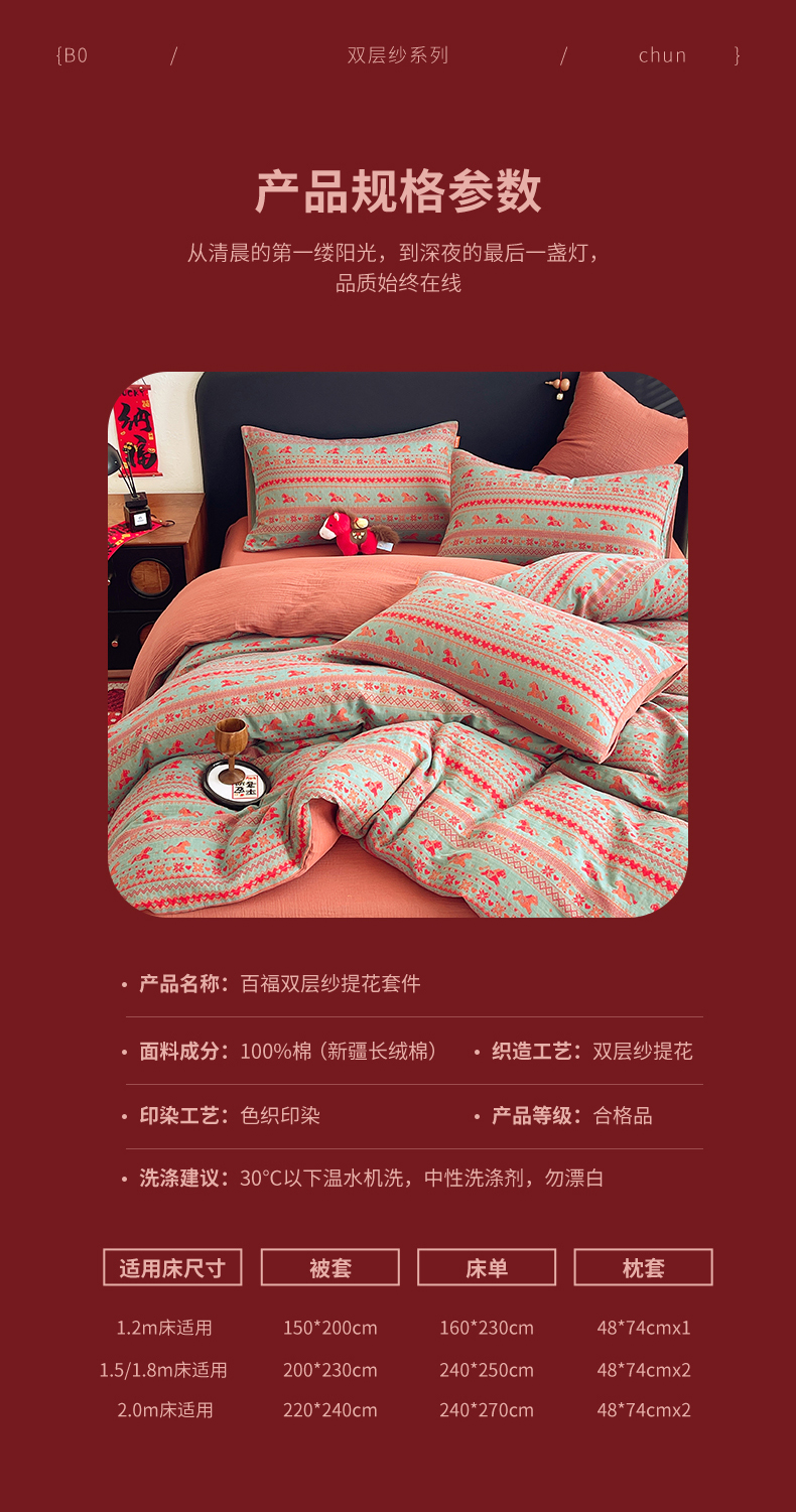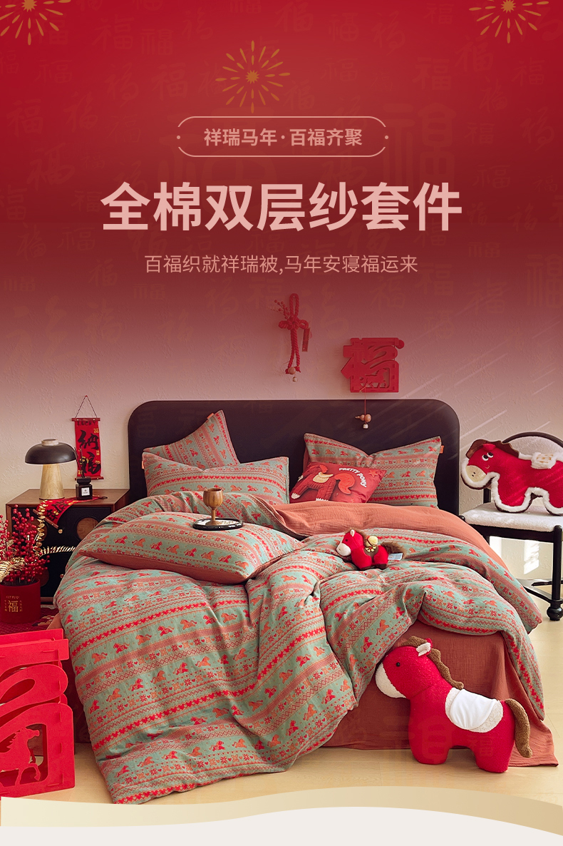 当前位置: 91家纺网 > 商品网购 > 床品套件 > 四件套 > 双层纱四件套 > 春皖家纺 2026新款全棉色织双层纱提花百福系列拉链款-四件套 绿绝影