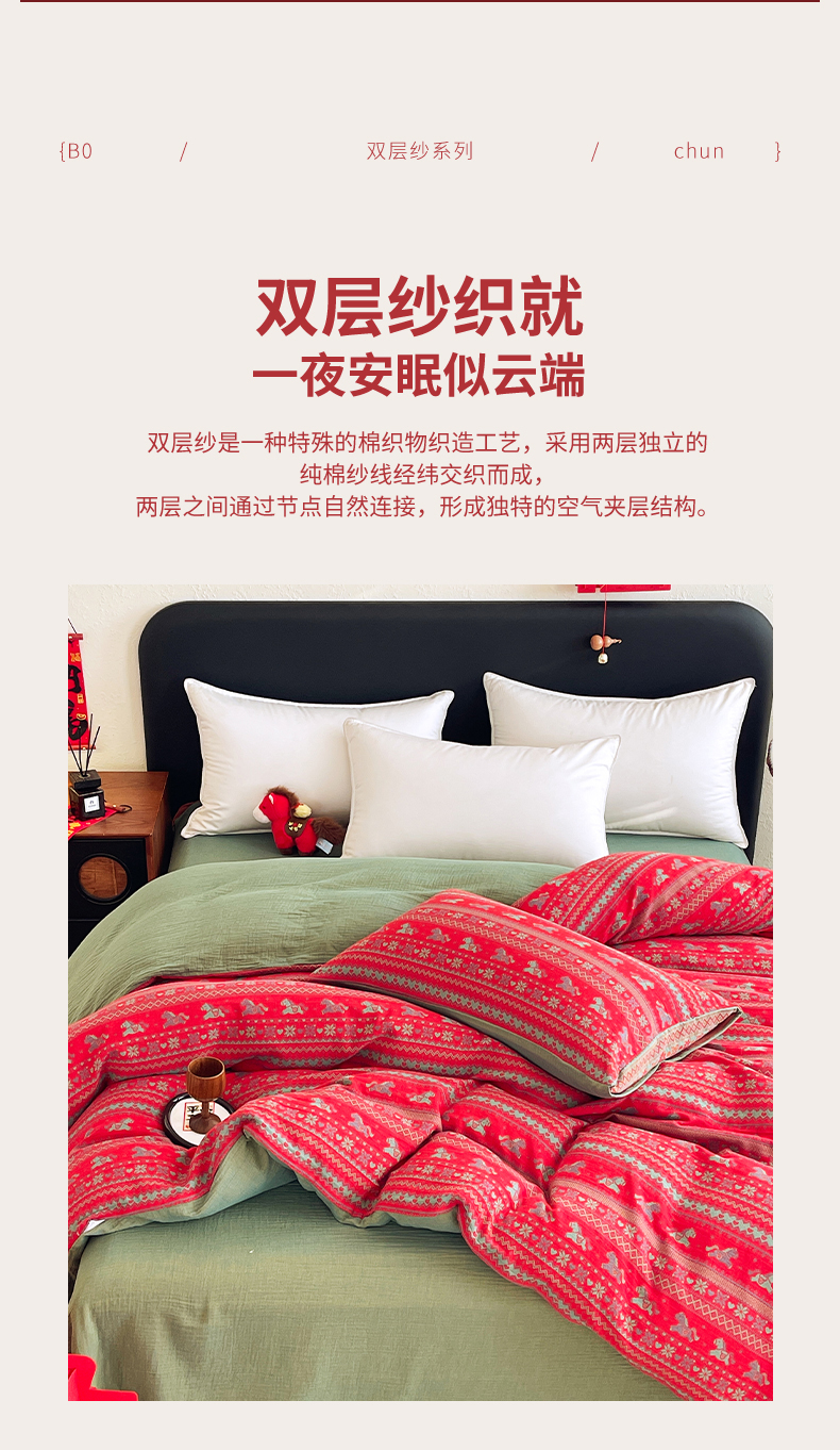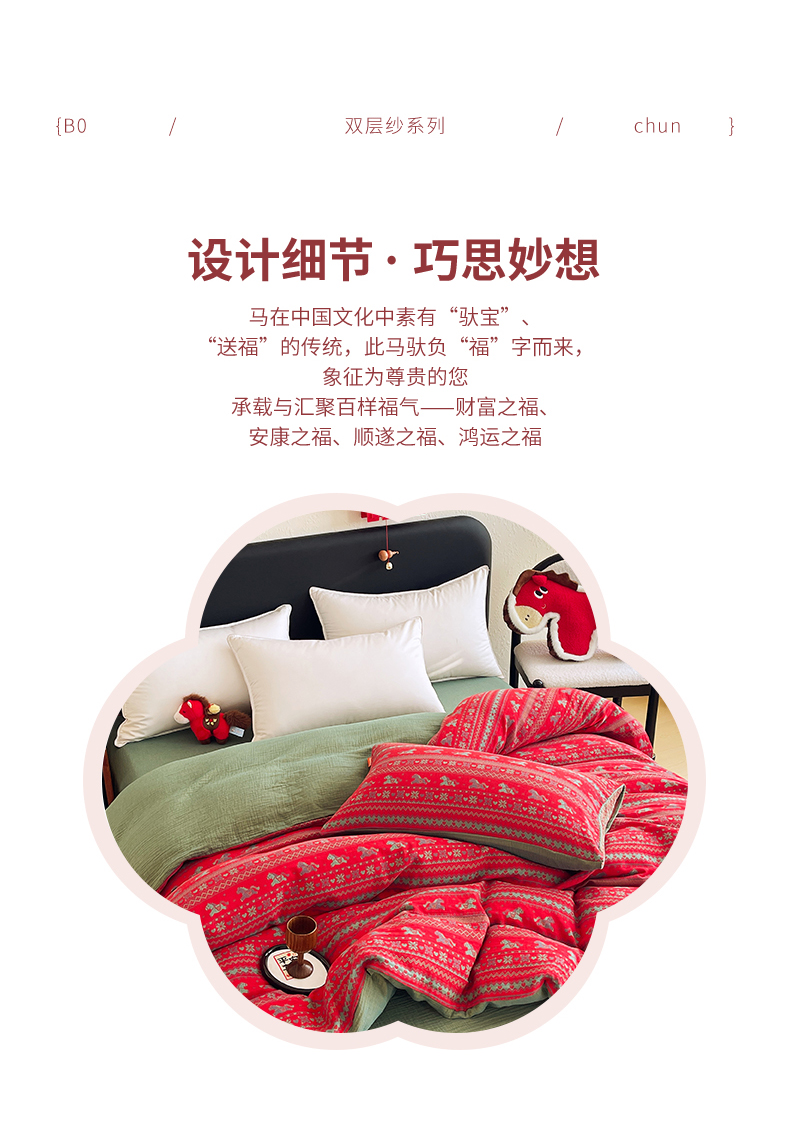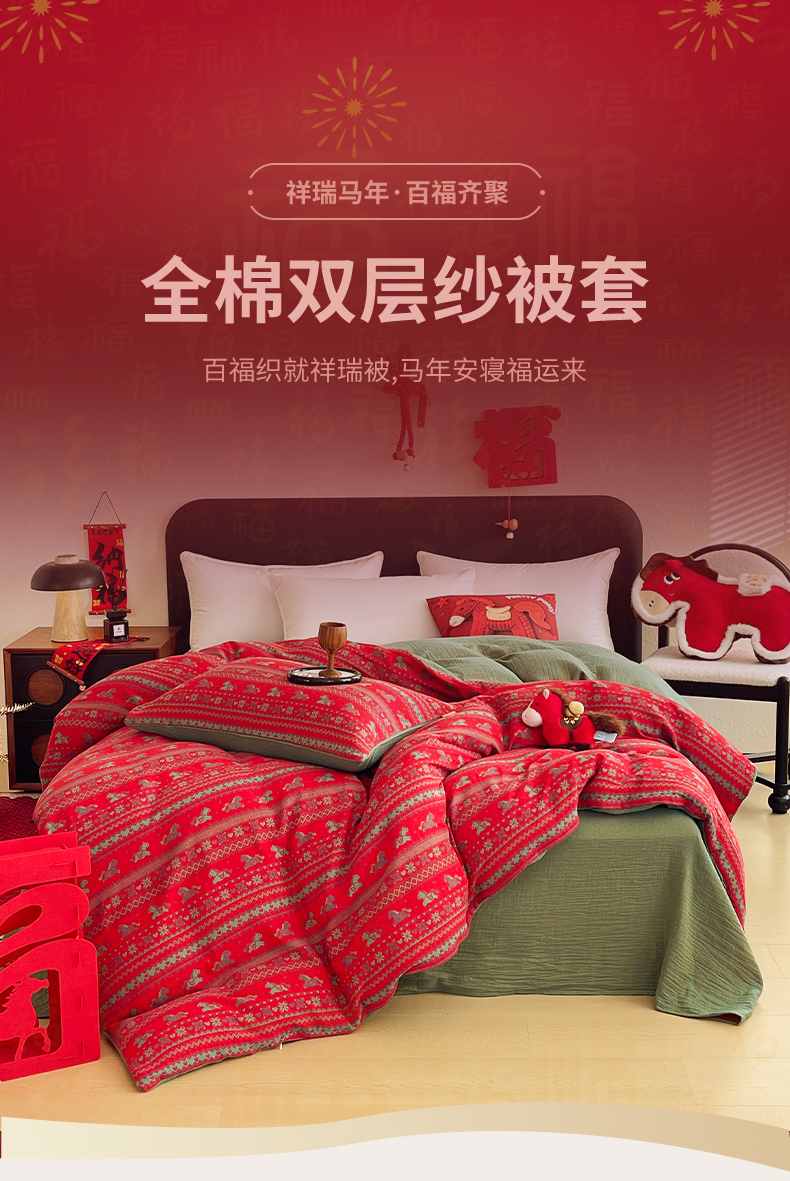 (总)春皖家纺 2026新款全棉色织双层纱提花百福系列拉链款-四件套,红百福,红赤兔,红福马,绿赤兔,绿福马,红绝影,绿绝影