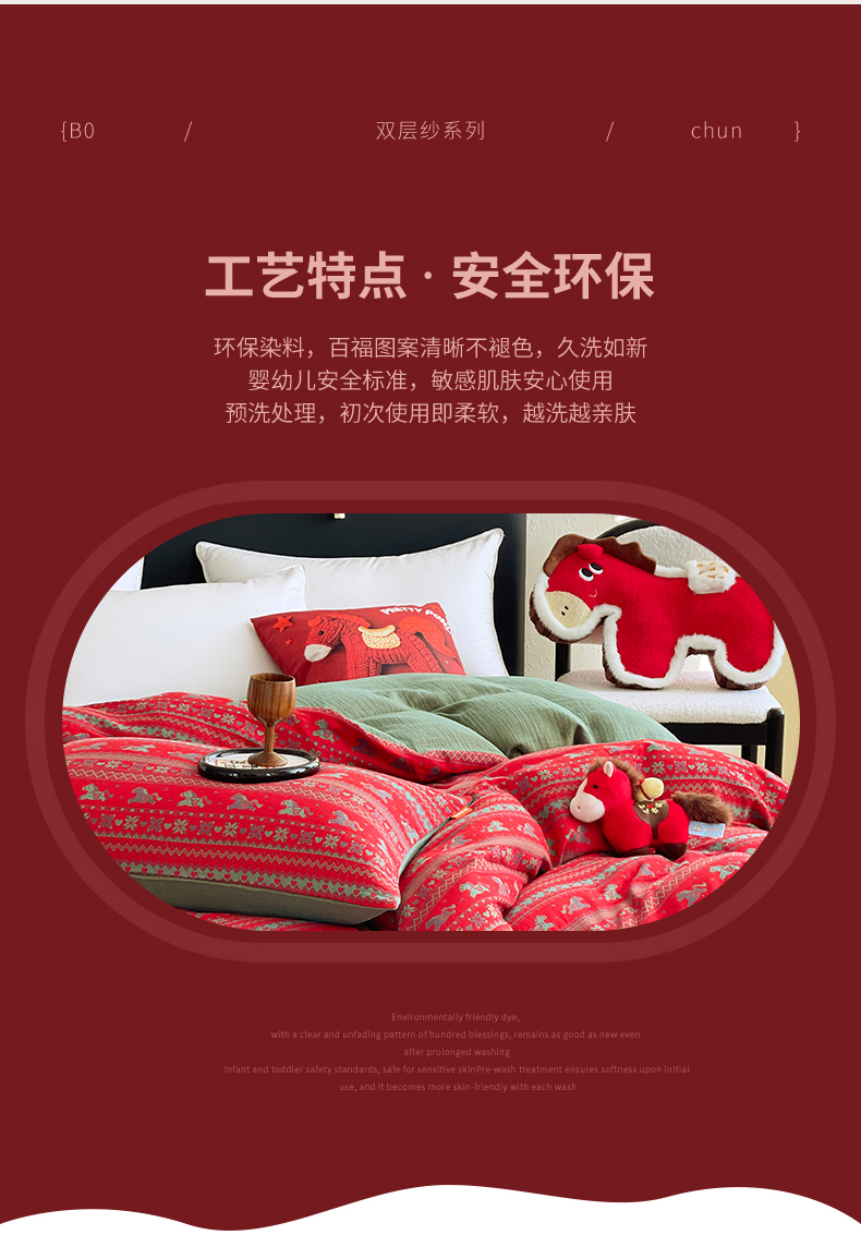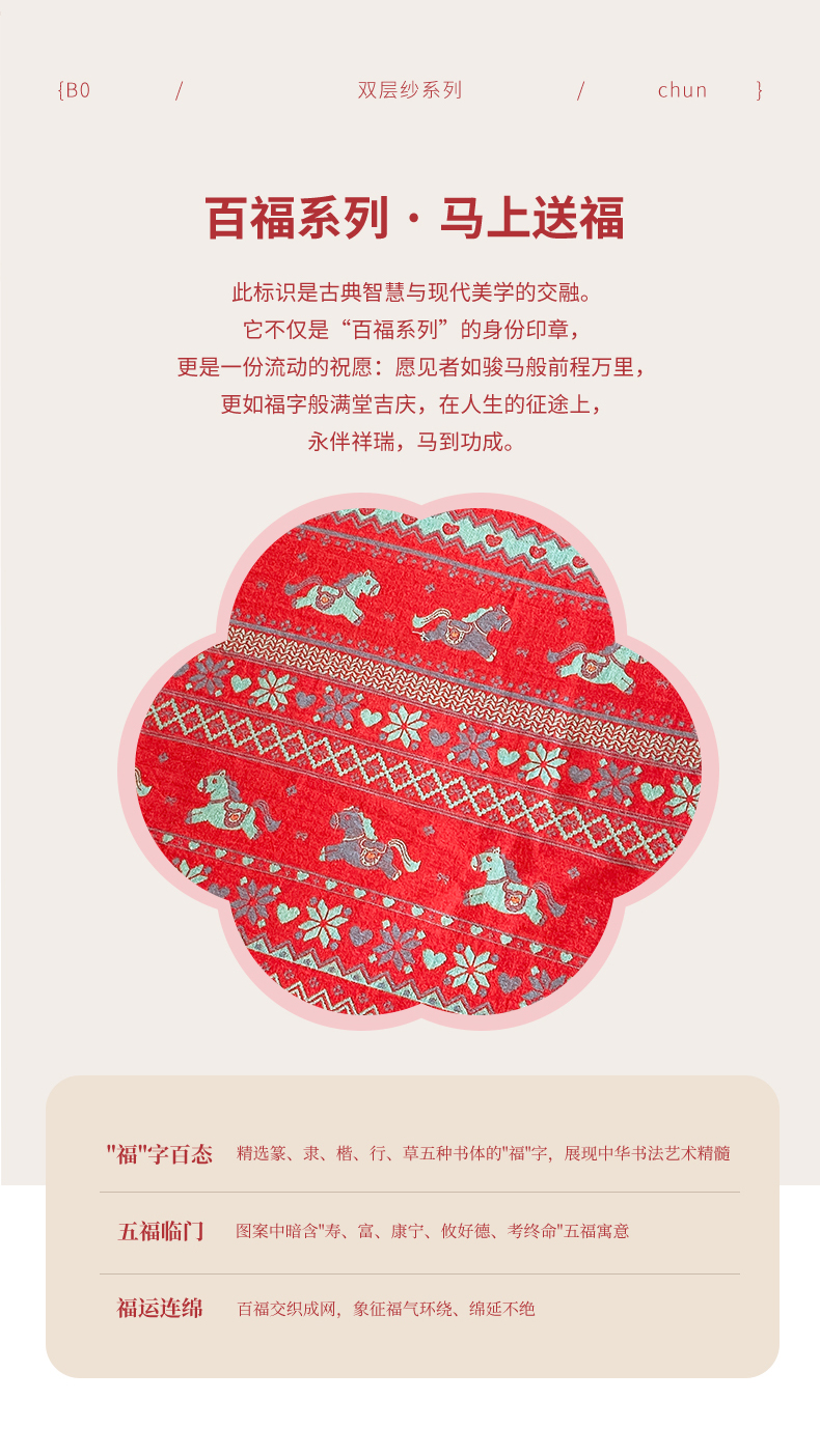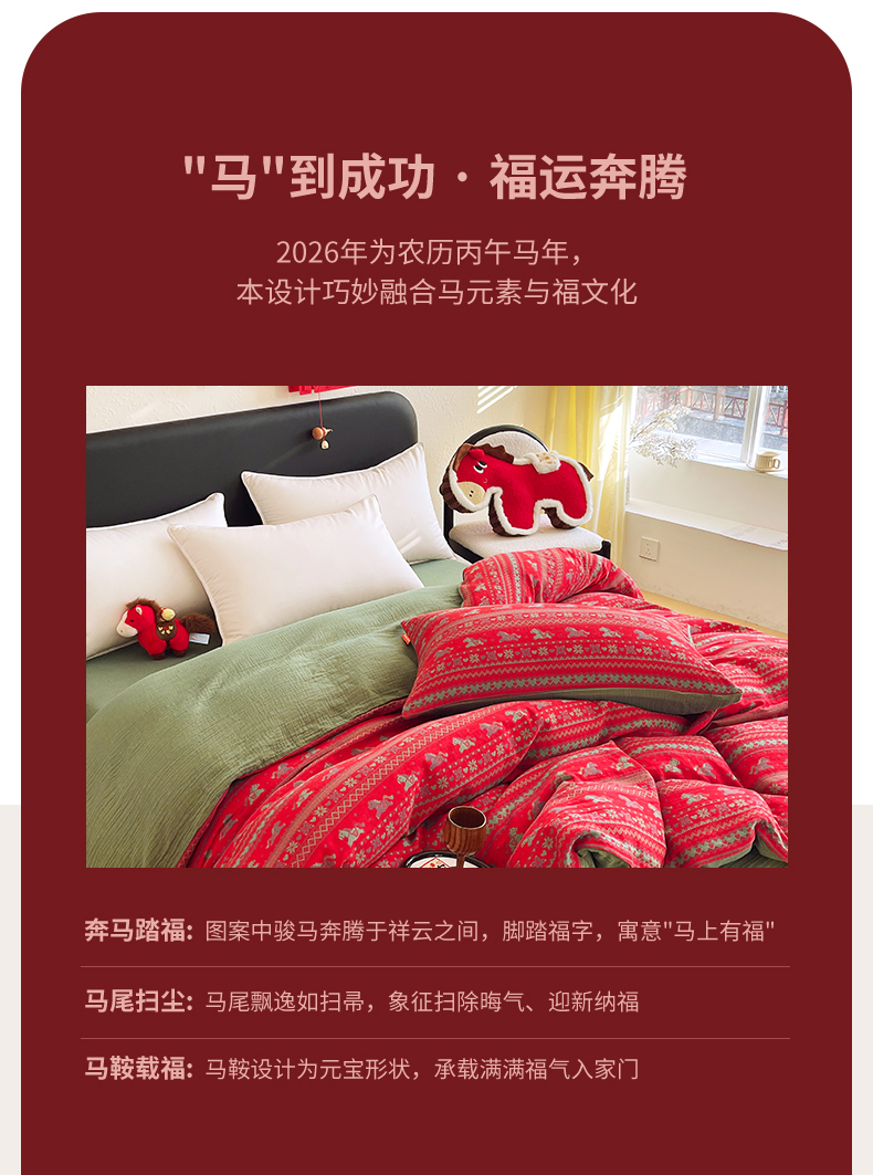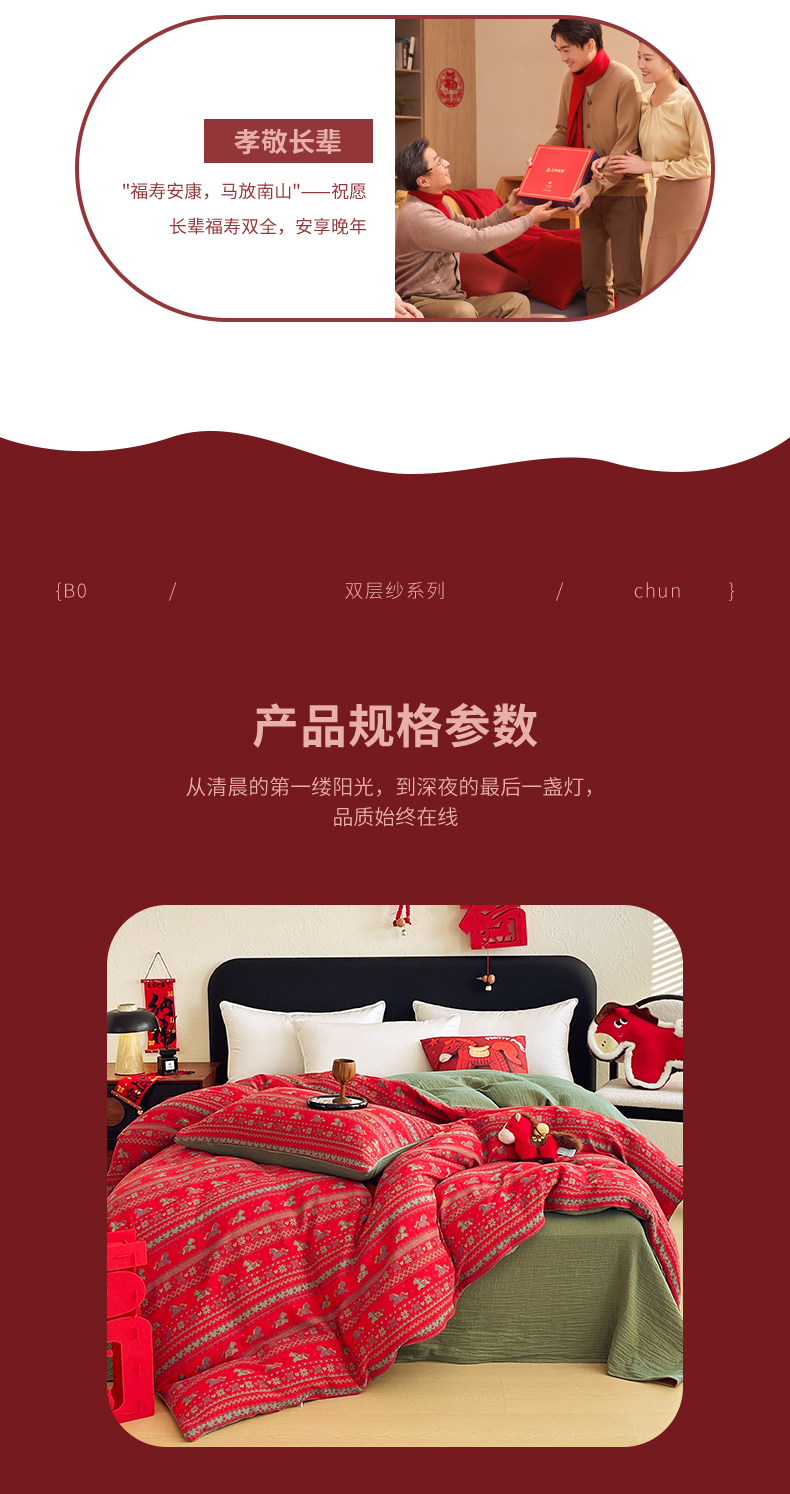 (总)春皖家纺 2026新款全棉色织双层纱提花百福系列拉链款-四件套,红百福,红赤兔,红福马,绿赤兔,绿福马,红绝影,绿绝影