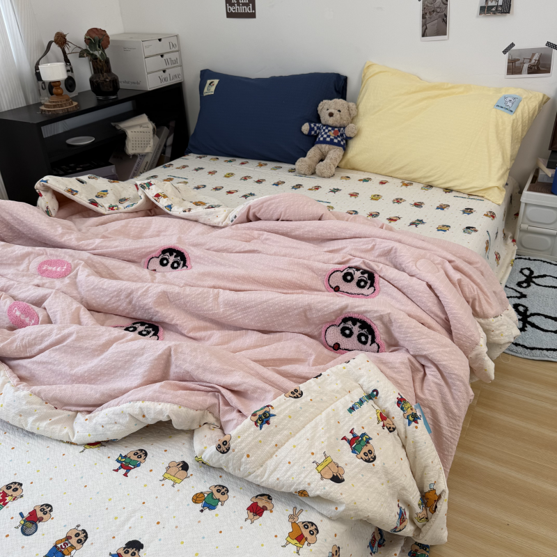 • 91家纺网 家纺一手货源 找家纺 (总)三元色 2026新款正版蜡笔小新泡芙双层纱夏被夏凉被,樱粉小新,动感超人,欧耶小新,小新三连拍,小新学长