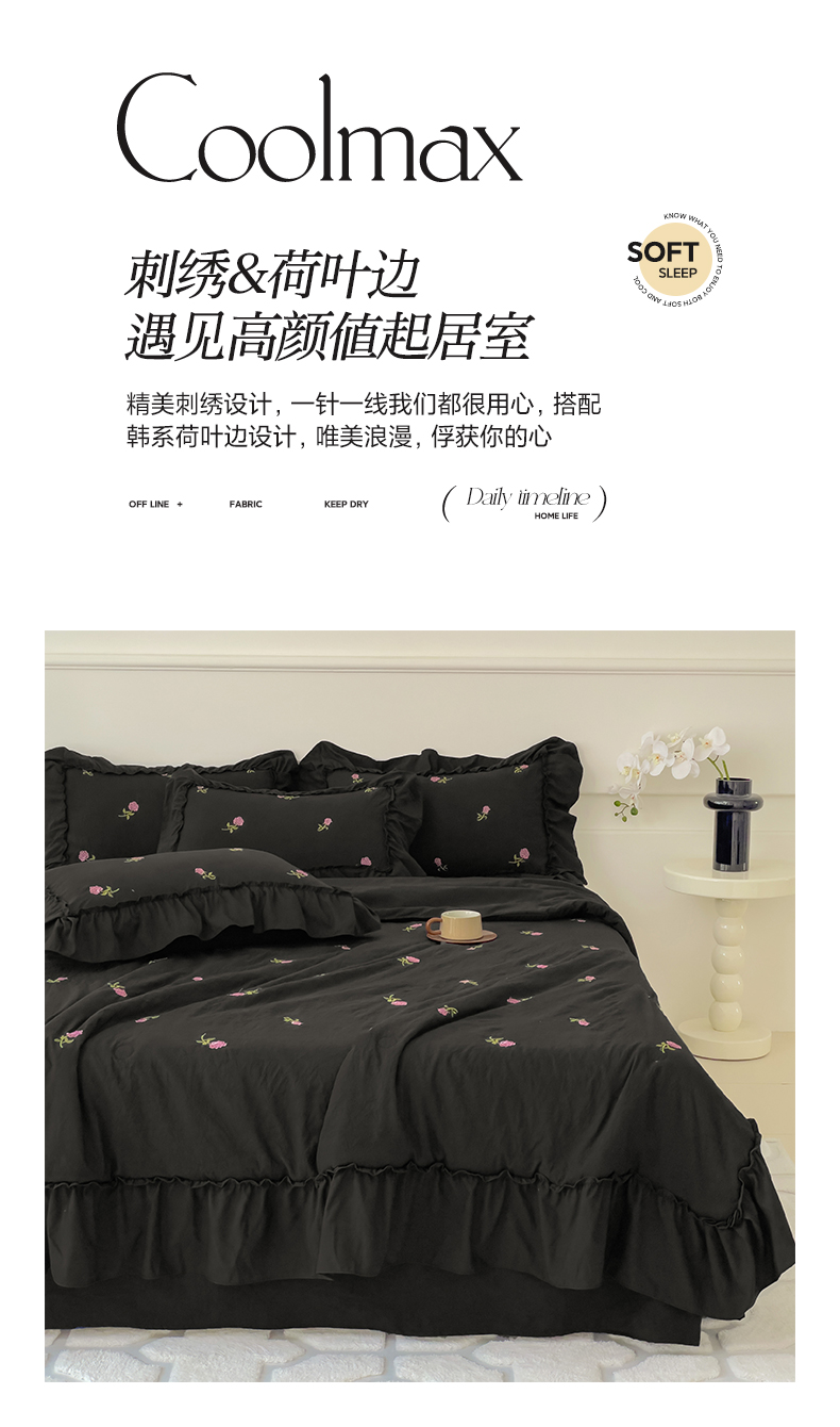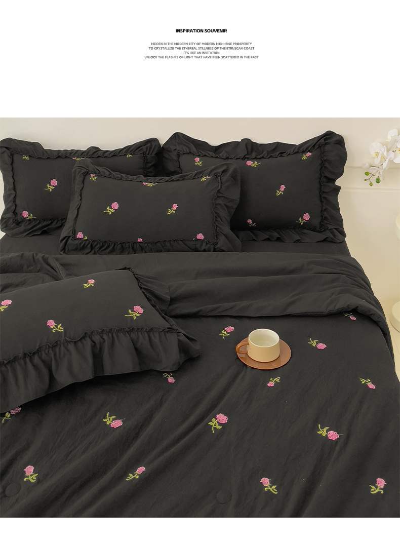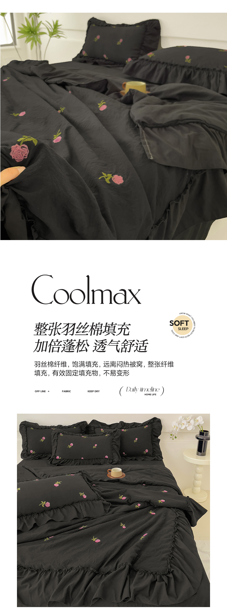 商品名称:你好美丽 2025新款亲肤舒适水洗磨毛刺绣荷叶夏被四件套—初荷(场景二) 初荷-黑玫瑰